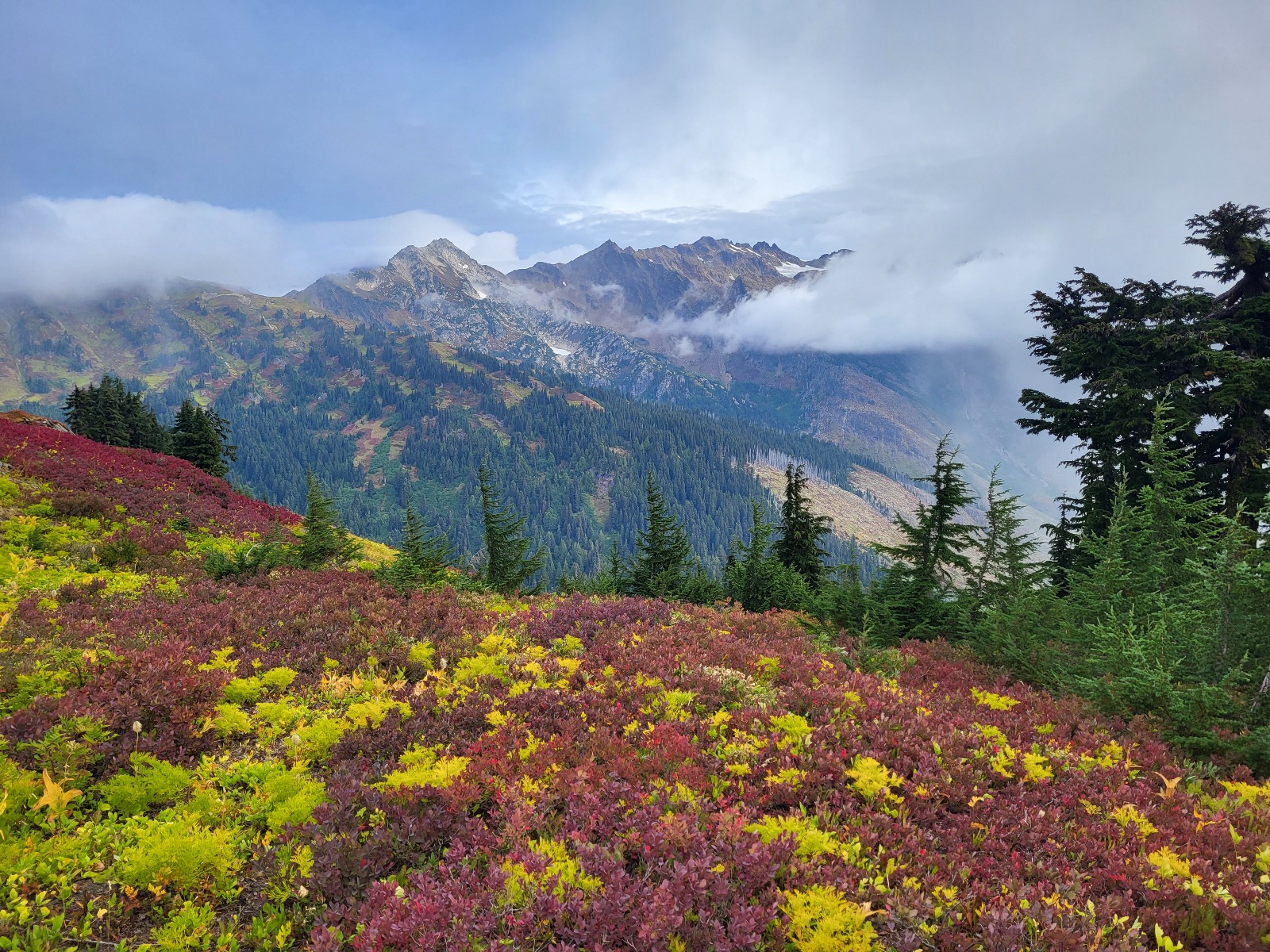 Opět nádherný výhledy a svahy jsou pokrytý červenejma borůvkama. Skrz mraky občas prosvitne slunce, ale většinou jenom na par sekund a mraky zase všechno prekryjou.