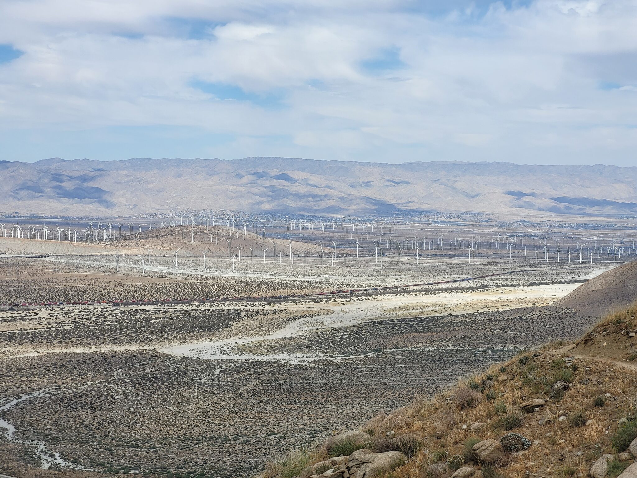 Dobírám znovu šest litru (batoh má tunu) a koukám do mapy. Už od rána mi to vrtá hlavou. Jak to, že za tou 205. mílí nejsou žádný tent sites? Přede mnou obrovský údolí a v něm začínám rozeznávat co to jsou ty políčka. Ony to nejsou políčka, ale farmy větrných elektráren. Bože!!! To vysvětluje ten vítr. Kde jinde je postavit, že jo. Takže to neni jenom na chvíli, to bude furt. Podle farout je nejbližší tentsite až za cca 16 mil. Sakryš, co teď?