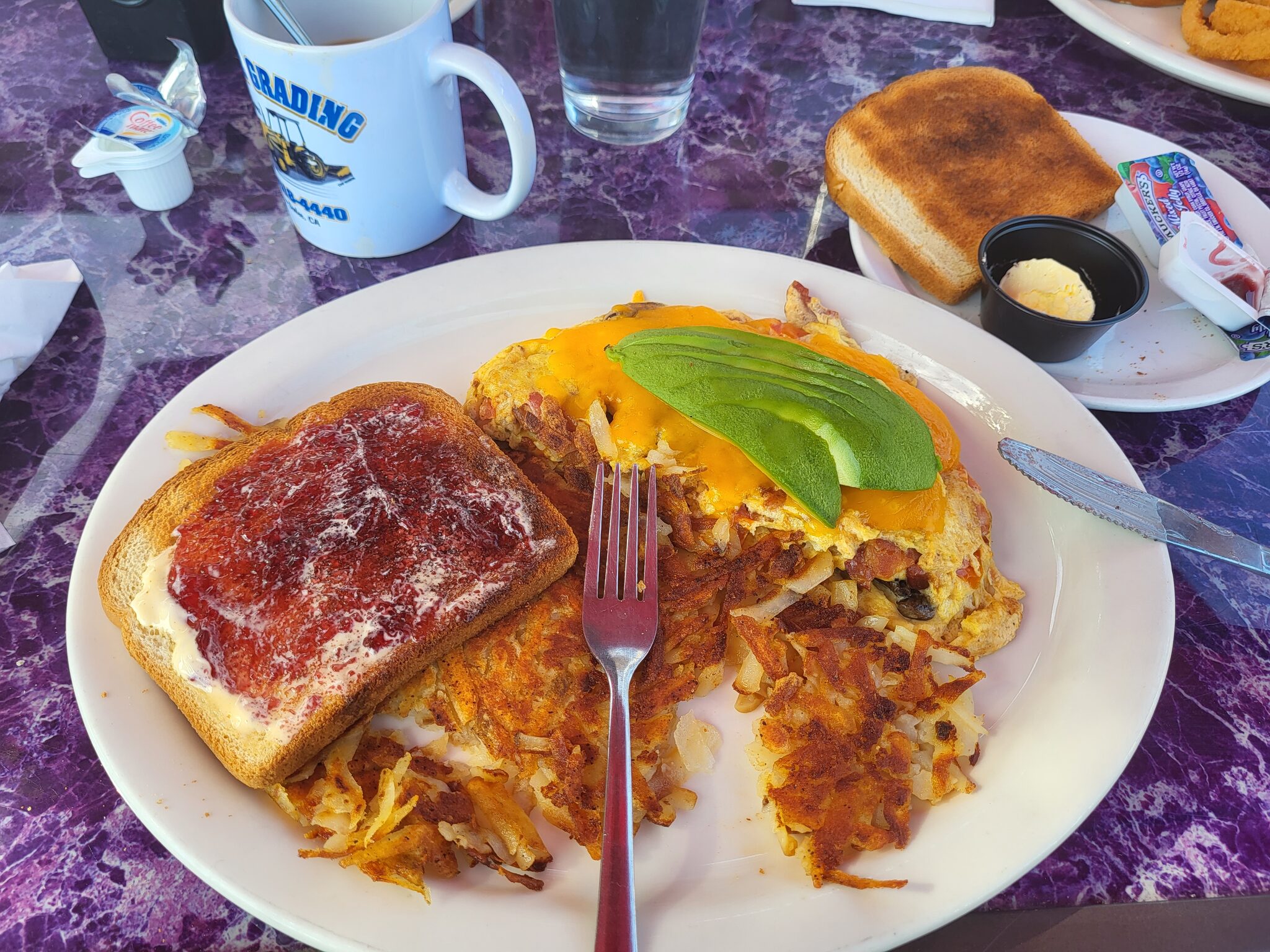 Pak míříme do města Aqua dulce (co tomu úspěšně říkám furt dolce gusto) a v půl osmé ráno filtrujeme vodu ze zahradní hadice v místním železářství. Martina si ale všimne, že cca za 200m je otevřená restaurace, která dělá vyhlášené snídaně. Rozhodování není dlouhé. Za 20 min už do sebe každý souká obrovskou porci proteinů v nějaké podobě. Ja v podobě omelety se slaninou a hash browns. Plus kafe.