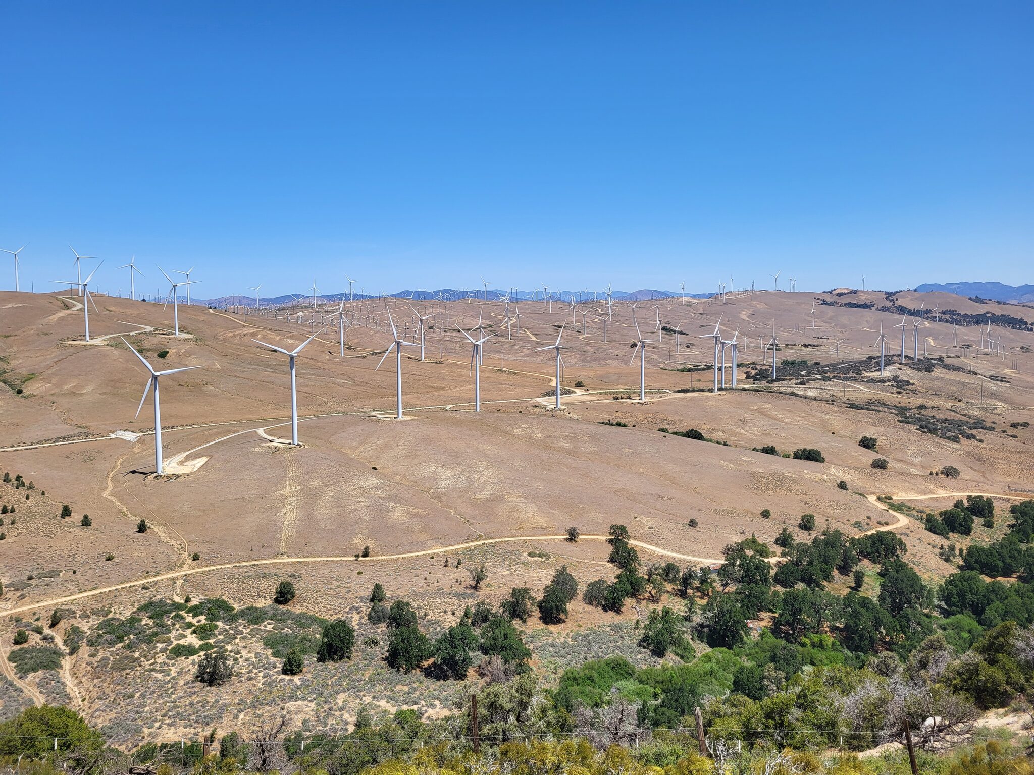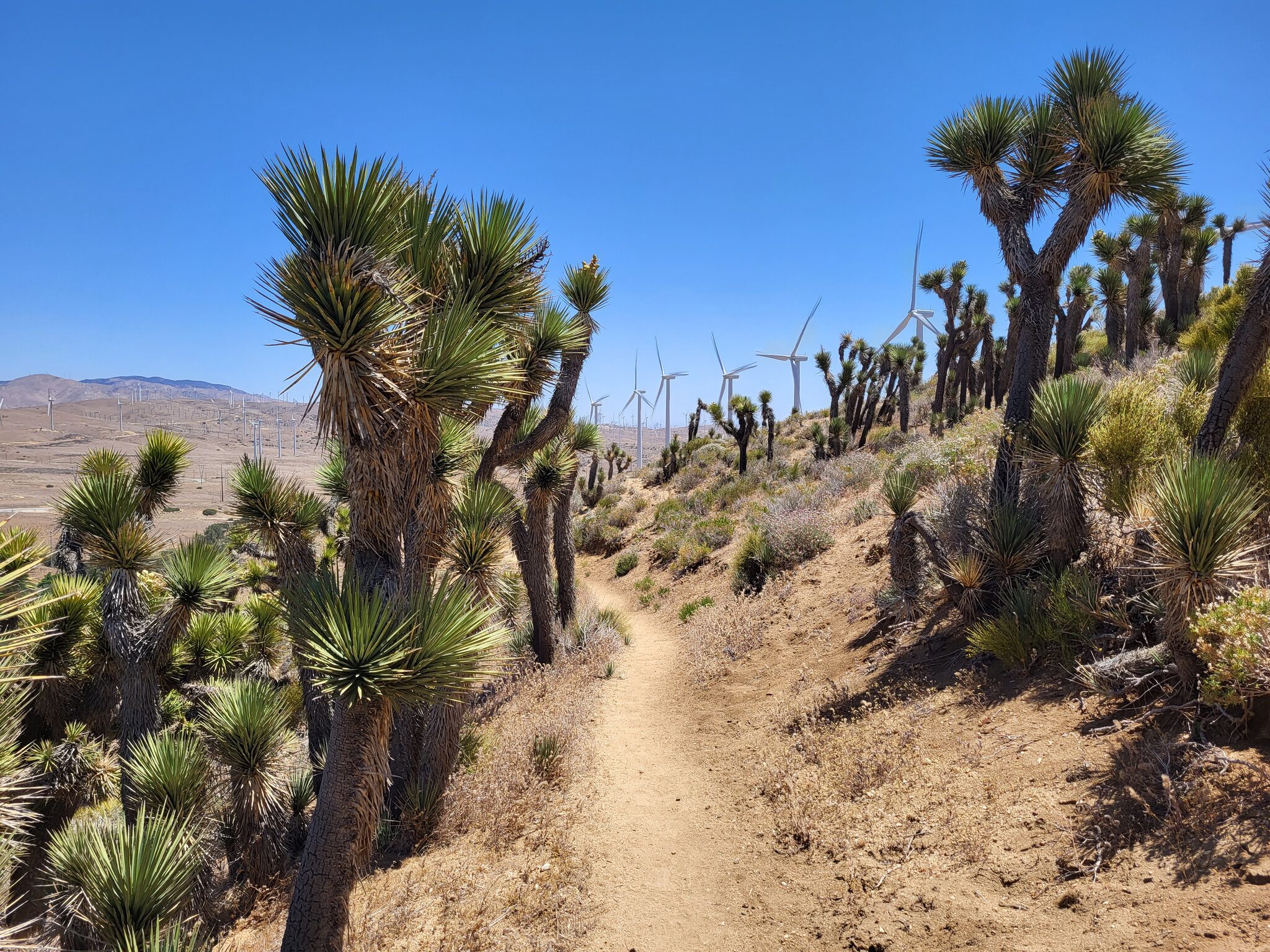 Po cca hodině ho dohoníme na místě, kde je watercache a jdeme na posledních 9 mil do Tehachapi. Sho je tak natešený na město, ze nám během chvíle mizí a nemůžeme ho dohonit. Je už vedro a ploužím se jako 🐢. Naštěstí je většina cesty z kopce. Opět míjíme wind turbine farmu, naštěstí nefouká tilik, jako včera.