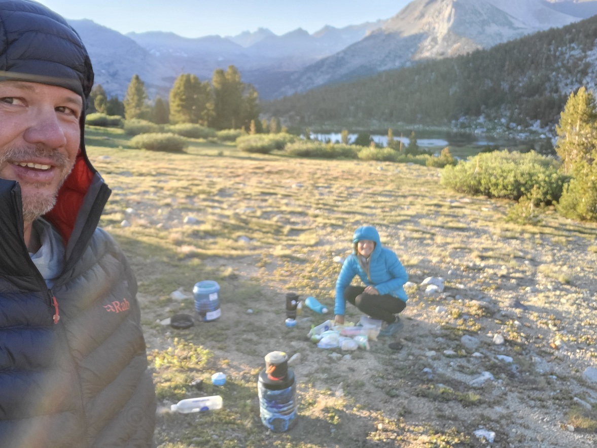 Chvíli se nahoře kocháme, povídáme s klukama, co jdou JMT a přišli z druhé strany a pak slezeme k jezeru a vaříme oběd. Já jenom takovou svačinu a teplý čaj. Trošku se bojím, jestli mám dost jídla a velke jídlo si schovávám na večeři. Je to moc hezké místo. SaH říká, že si tu připadá jak v karibiku. No nevím, ty sněhové jazyky na protějším kopci mi k tomu moc neštimují, ale nechci ji kazit radost.