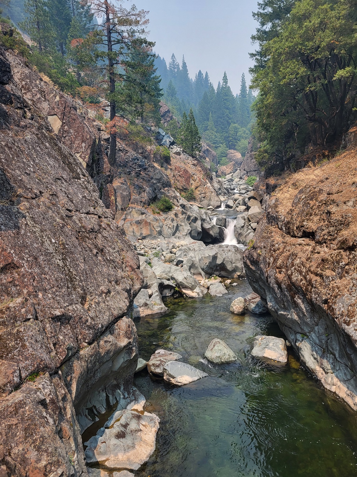 Po chvili slyším uz silnici kam mířím na stop do Sierra city. Switchbackuju dolu z kopce a slyším vodu. Ha, vodopády. Ok, tak jsme mudrovali dobře.