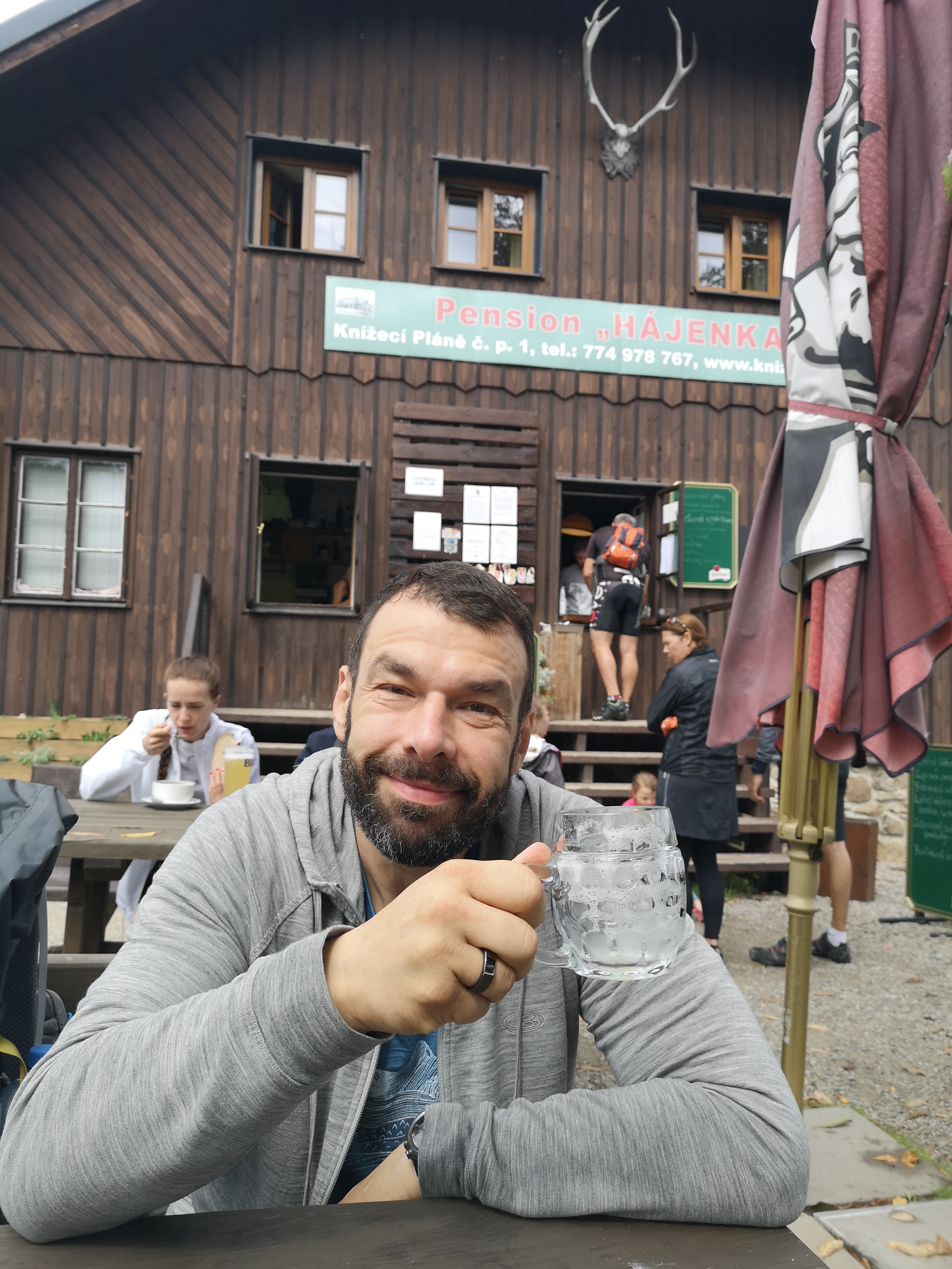 Sraz máme s Robem odpoledne v Novém Údolí. V krčmě Vagon dáváme pivko a vyrážíme směr nouzové nocoviště Strážný. Na místo dorážíme až za tmy a poslední úsek je velmi napínavý. Cesta je zavalená popadanými stromy a musíme je často obcházet lesem, což je ve tmě úkol nelehký. Robová gorilla utrpí při podlézání kmenu menší ujmu, ale nic co by šitíčko nespravilo. Na nocovišti jsou už 2 kolegové. Stavíme stany, děláme večeří, chvíli povídáme, ale spát jdeme brzy.