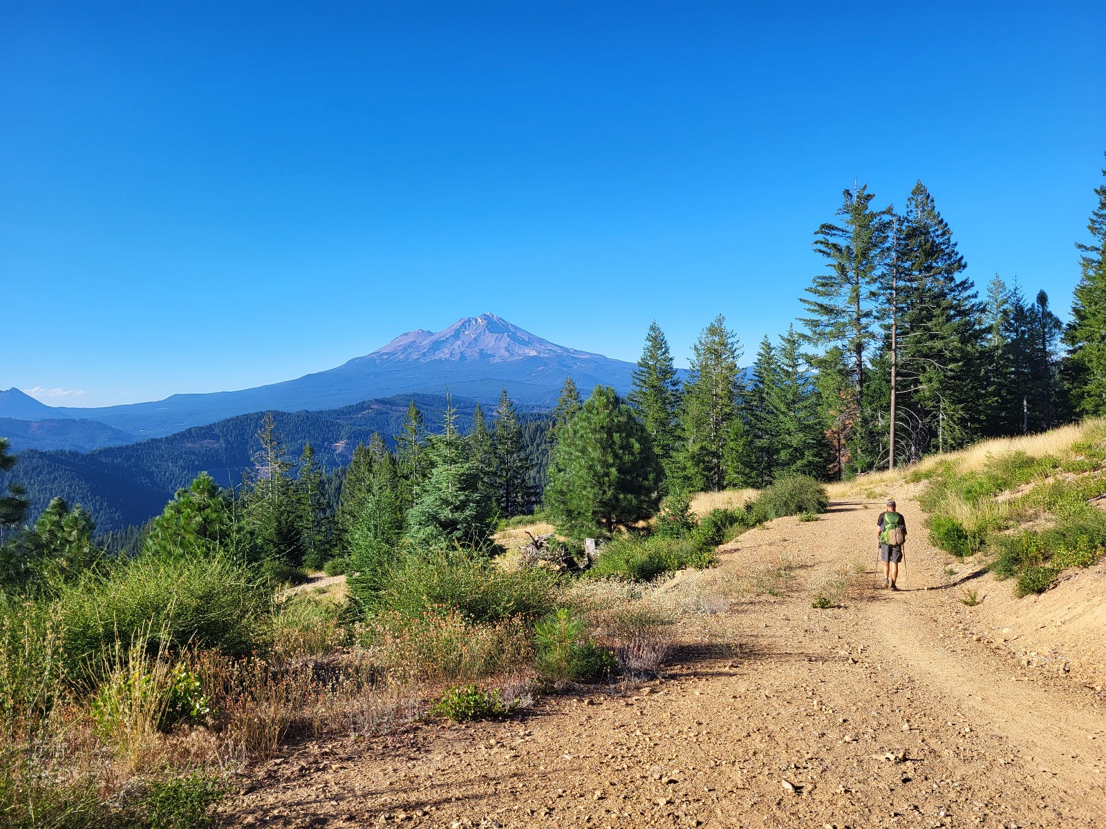 Po cca 2 a půl hodinách pokračuju. Je to opět do kopce, ale už mi ty kopce ani moc nevadí. Postupně mě předhání všichni, ale nahoře se potkávám s PaH a bereme to alternate cestou s krásnými výhledy na mt. Shastu.
