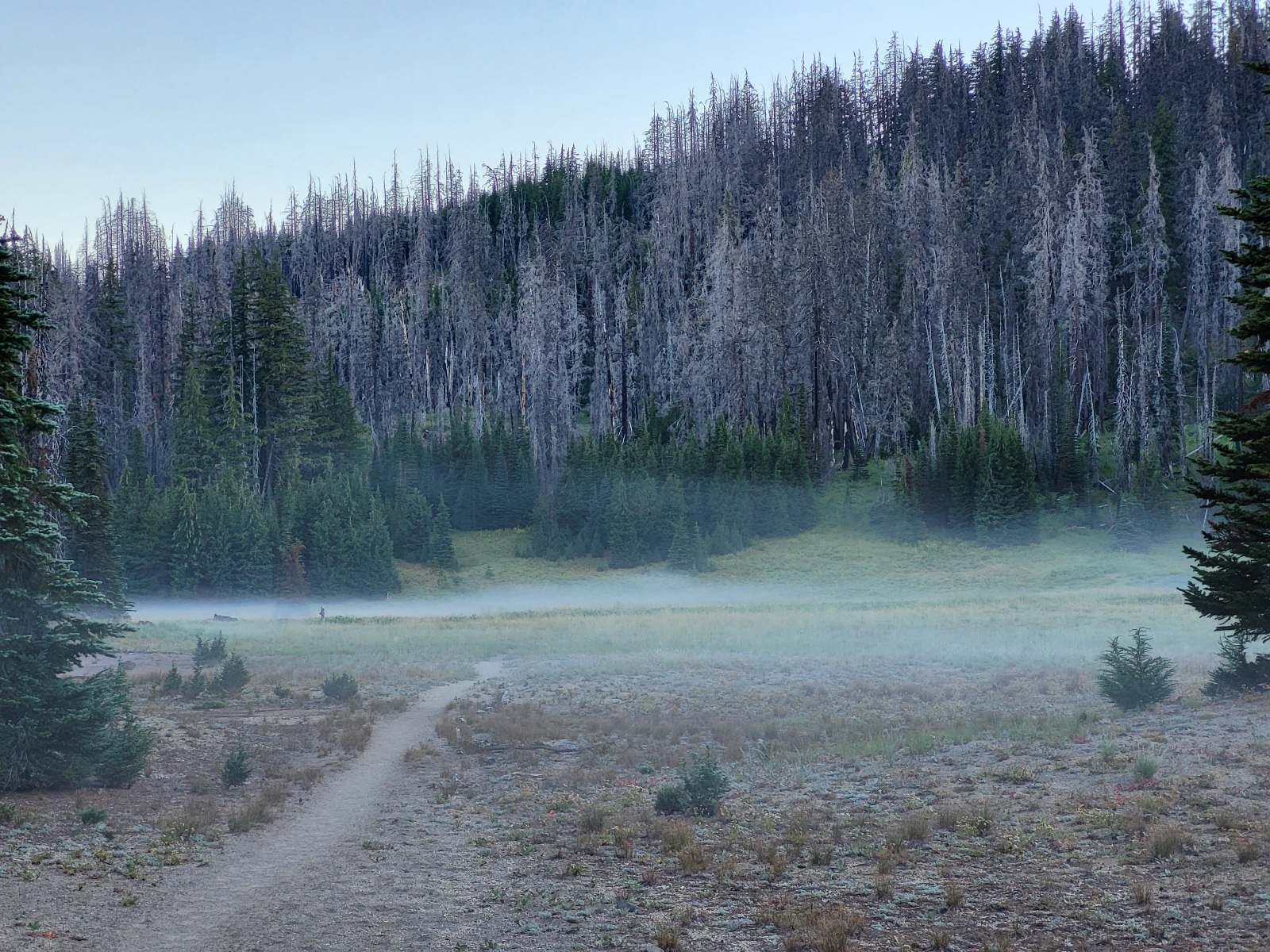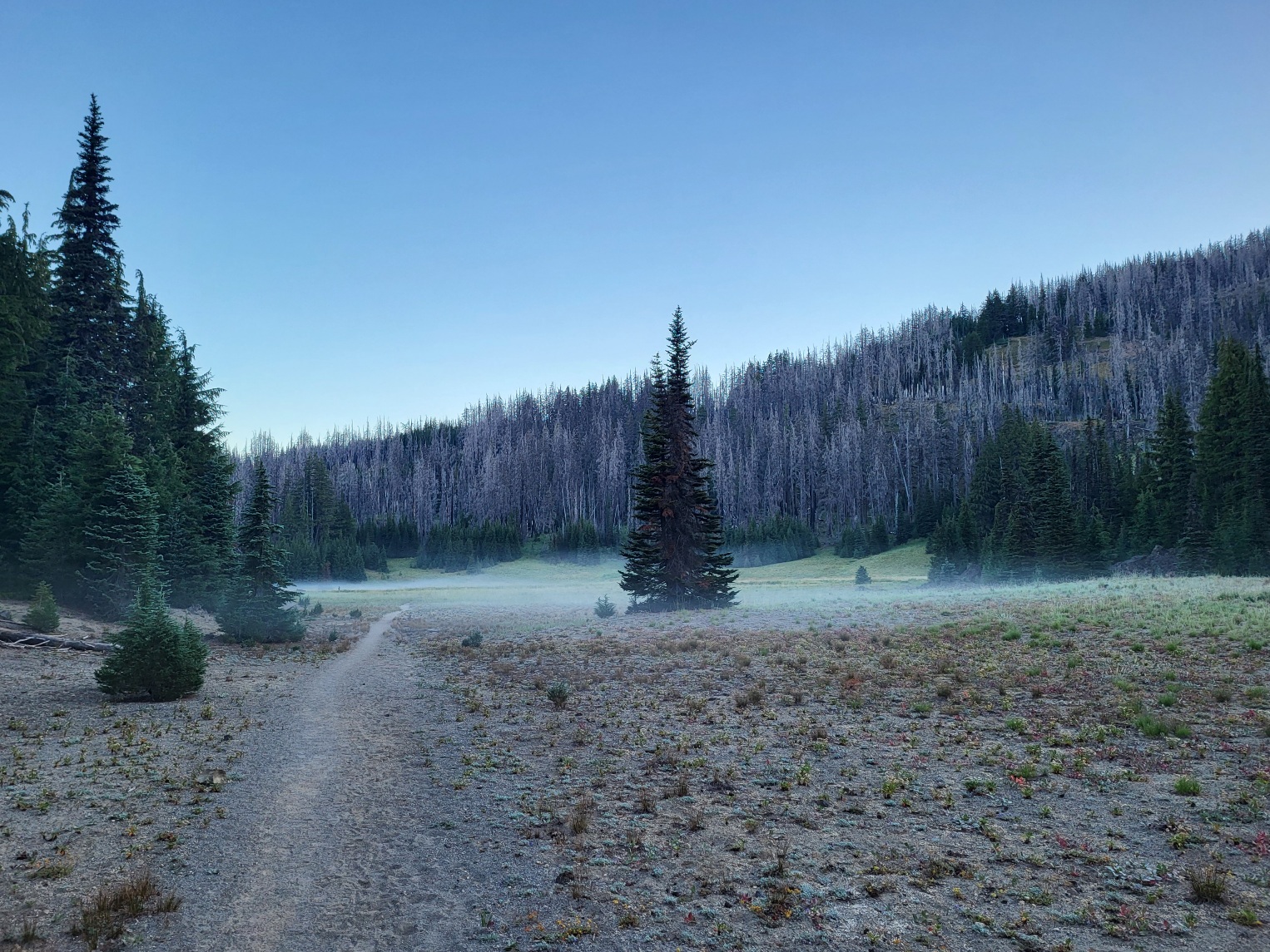 Dobírám vodu pokračuju dál, mám úplně zmrzlý ruce. Rukavice jsou taky v tom bearcanu. Jde se lesem a docela mi to frčí, takže dělám pauzy po 6 a 12 mílích. K obědu dělám kaši s tuňákem a hořčicí a poslouchám zdivočelou.