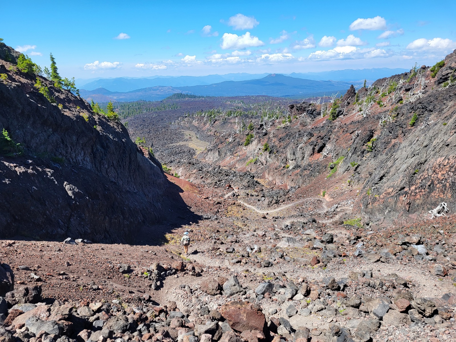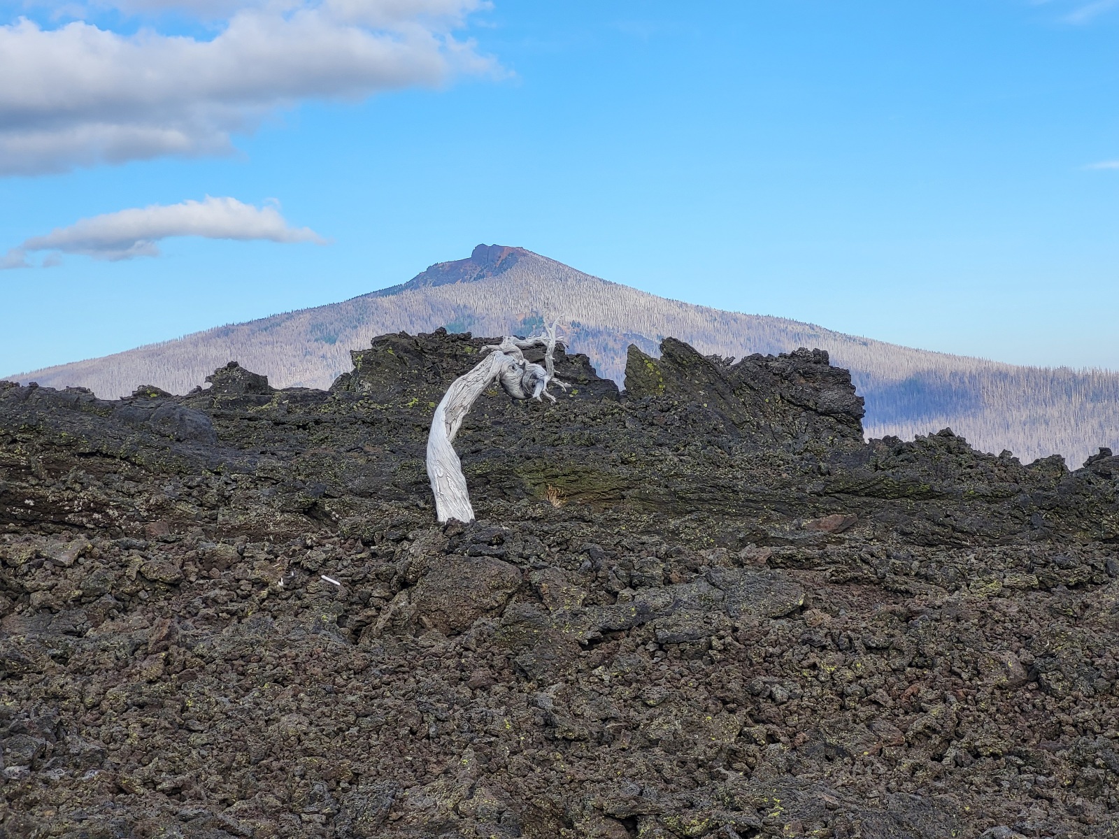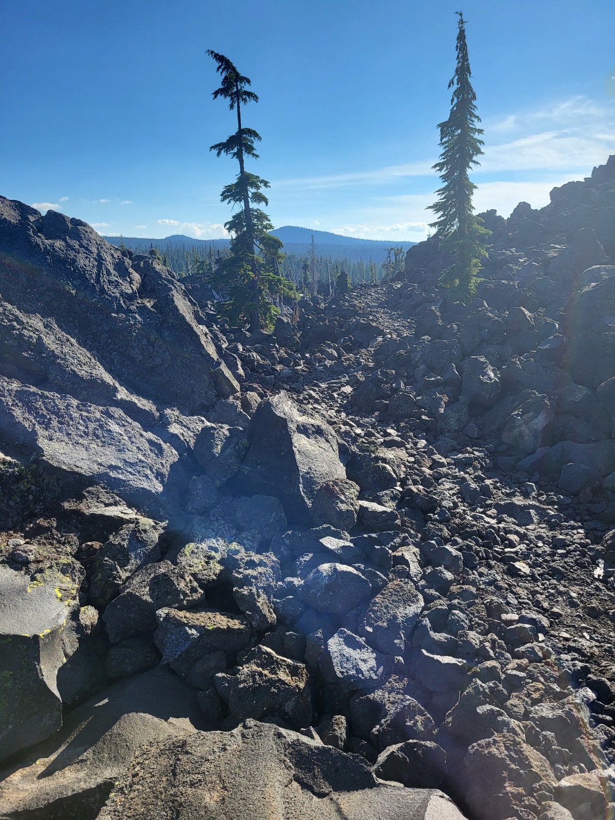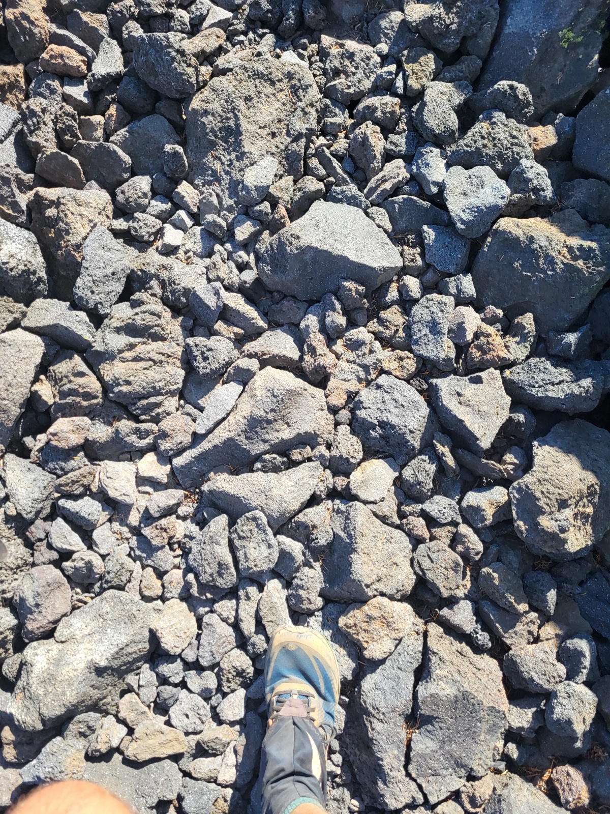 Dorážím k jezeru. Dělam očistu a dobírám vodu. A přichází dnešní zádrhel. Čeká mě prvni, ze 3 velkých lávových polí. Jsou vždy kolem 2 mil dlouhé a na nohy a boty je to masakr. Peru se statečně, ale je to fakt boj. Neustále se na tom zvrkávaj nohy a tlačí to do nohou. Kameny jsou strašně ostrý a špičatý. Ale i tohle uzemi, ikdyž je skoro úplně bez zivota je svym způsobem hezký.