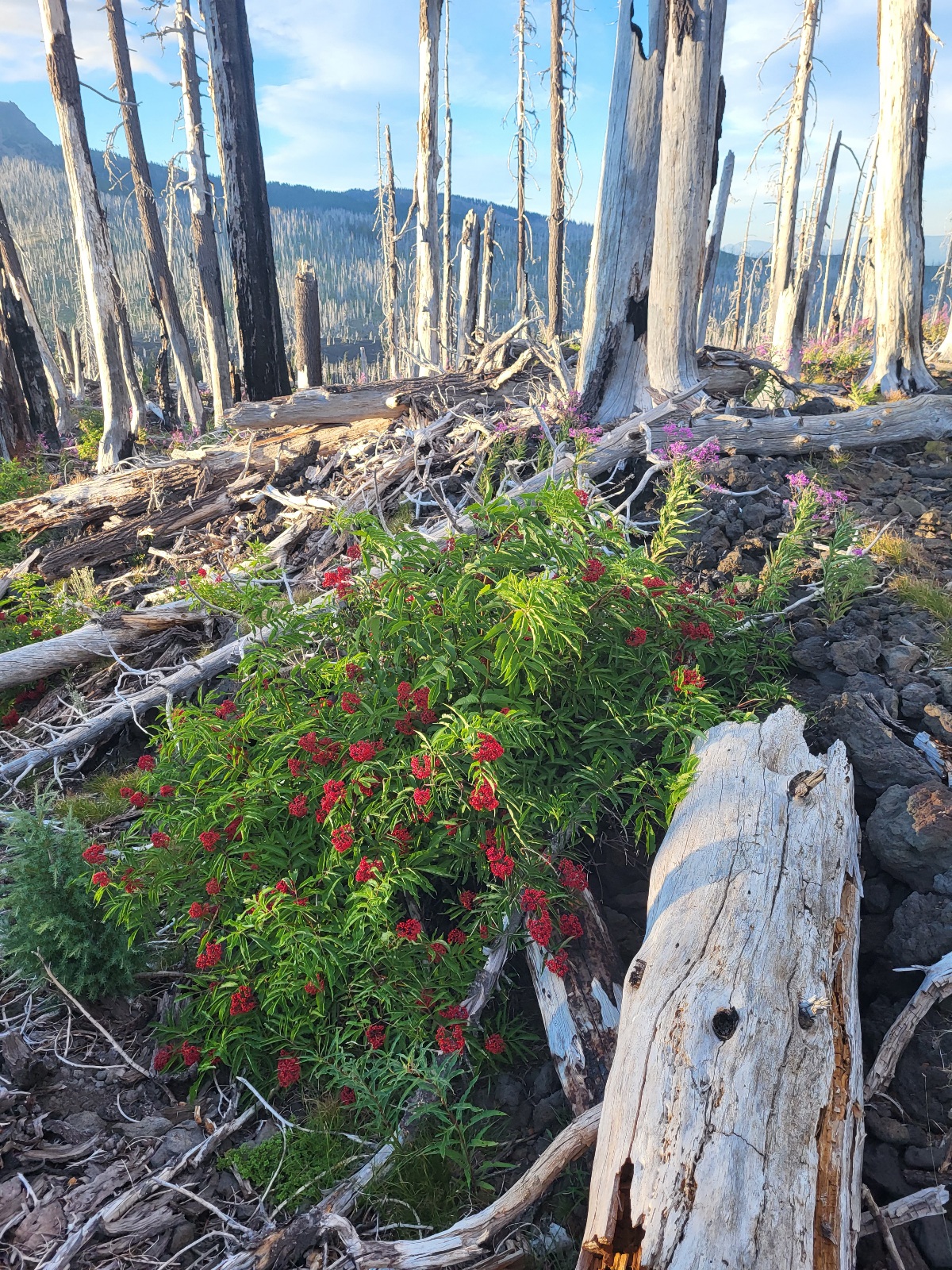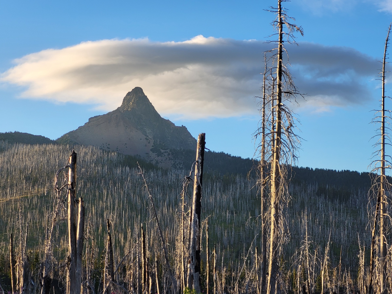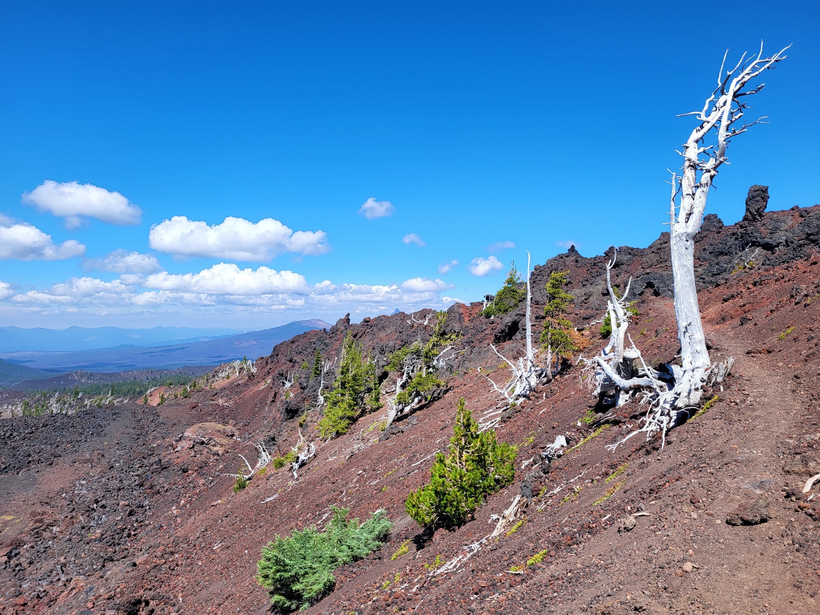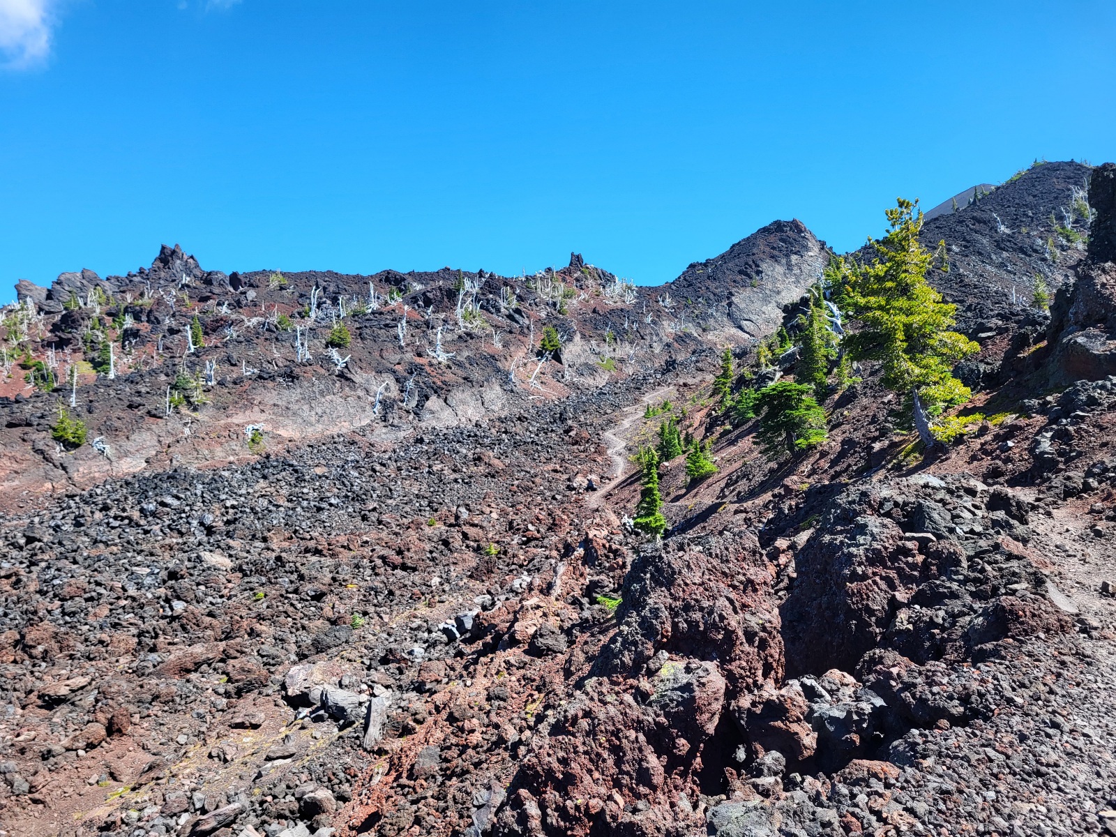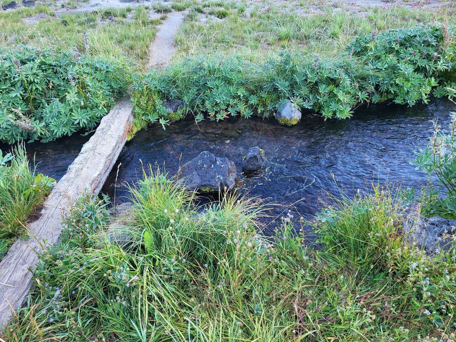 Dorážím k jezeru. Dělam očistu a dobírám vodu. A přichází dnešní zádrhel. Čeká mě prvni, ze 3 velkých lávových polí. Jsou vždy kolem 2 mil dlouhé a na nohy a boty je to masakr. Peru se statečně, ale je to fakt boj. Neustále se na tom zvrkávaj nohy a tlačí to do nohou. Kameny jsou strašně ostrý a špičatý. Ale i tohle uzemi, ikdyž je skoro úplně bez zivota je svym způsobem hezký.