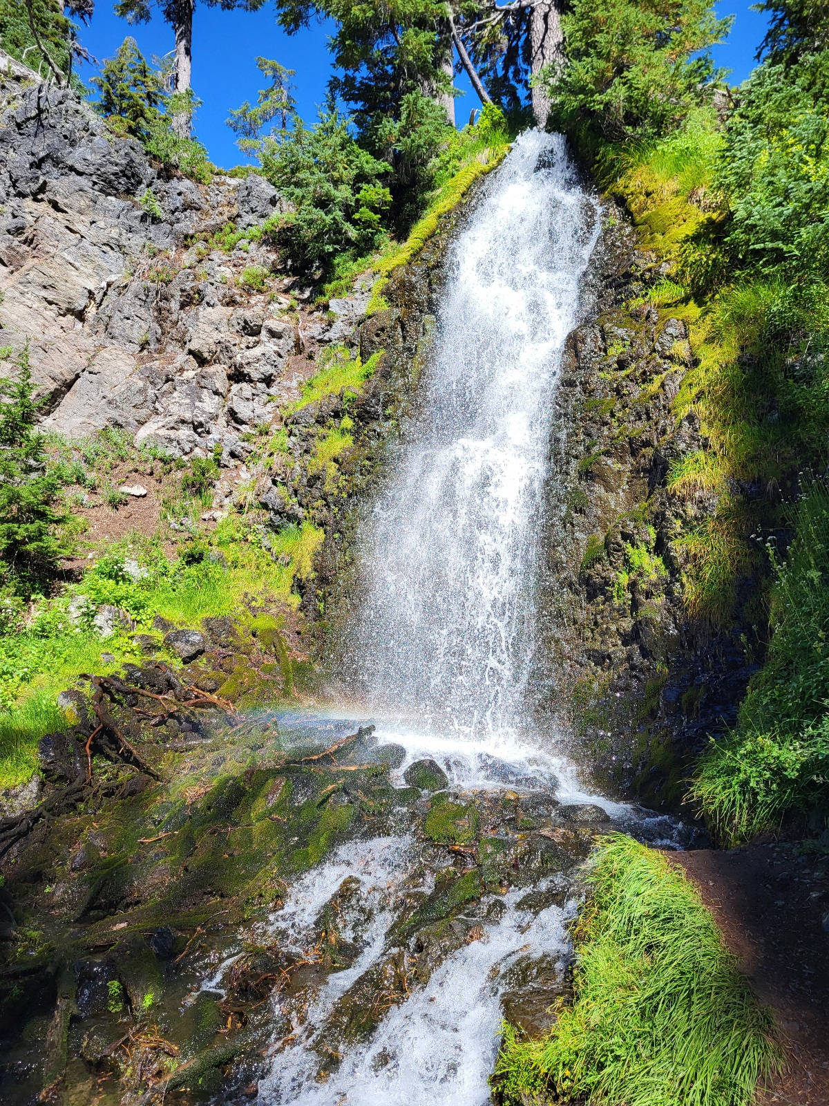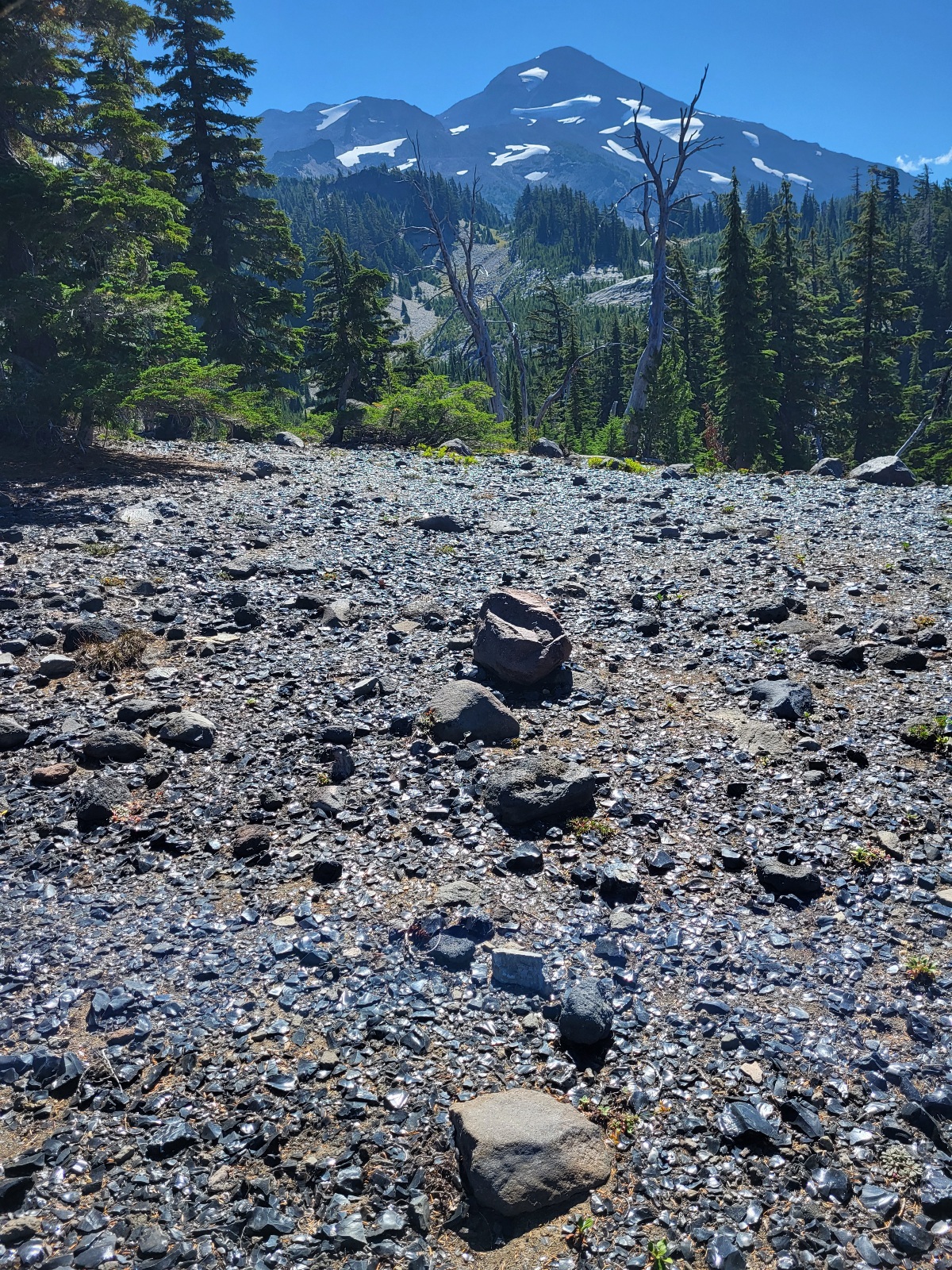 Trail vede kolem Obsidian falls. Hezký vodopád a všude jsou kousky obsidiánu. Trail pak vede územím, kde je ho nekonečně a blyští se ve slunci.