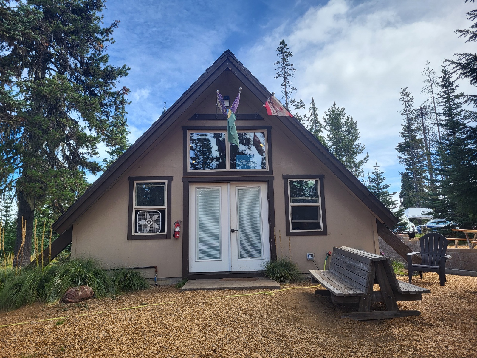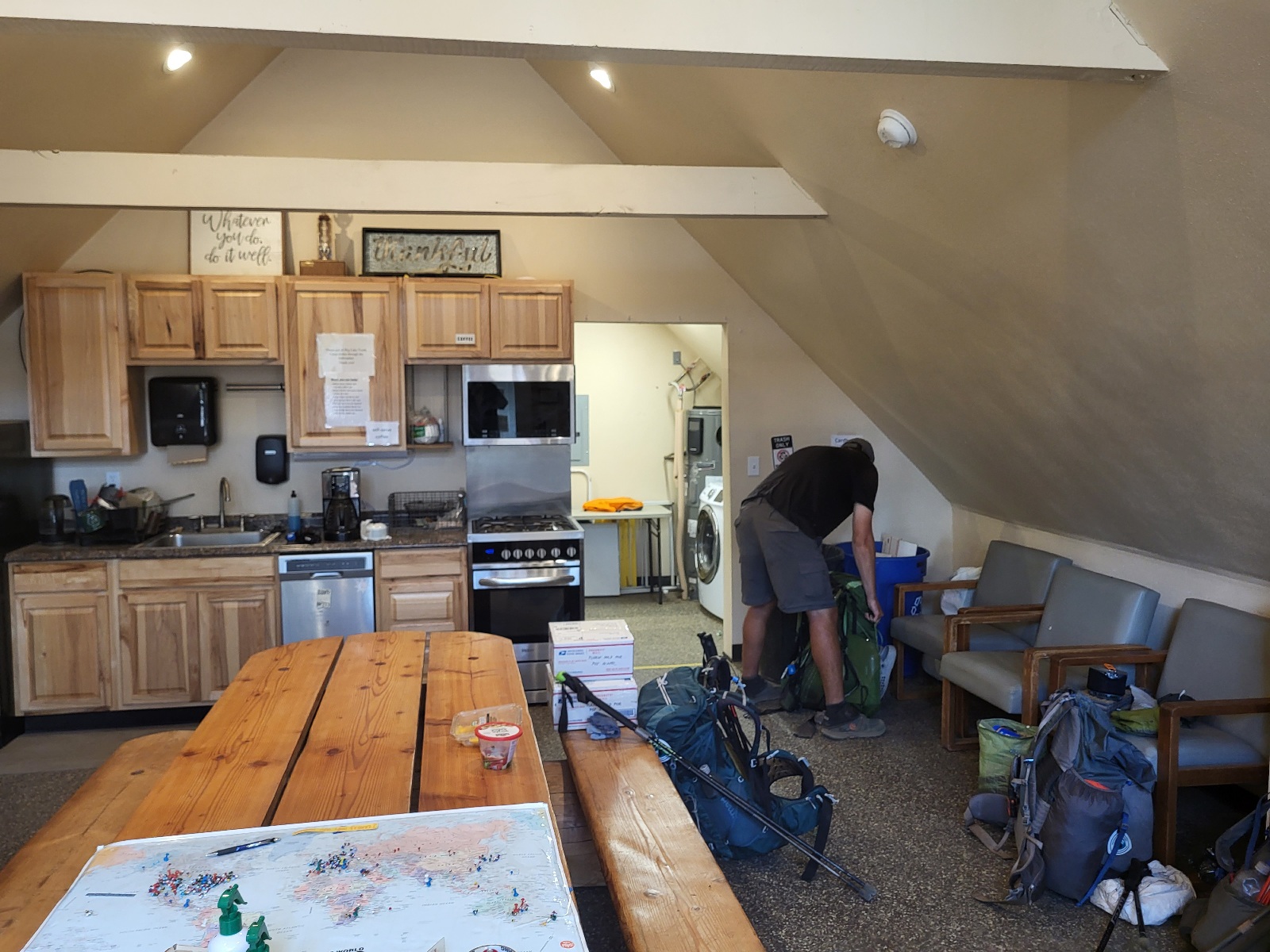 Pádím na snídani a mizi ve mně dvojitá porce vajíček, kroket, skořicových šneků, miska poridže a několik hrnku kafe. Sotva se hýbu. Vracím se kolem checkin kanceláře a zjišťuji, ze v sobotu/dnes není oběd a večeře, pouze formou balíčků, protože stuff má volno. To zamrzí, ale aspon mě tu nic nedrží a budu dřív plzpátky na trailu. Chvíli se toulám kempem a fotím si to tu. Má to mládež fakt pěkný.