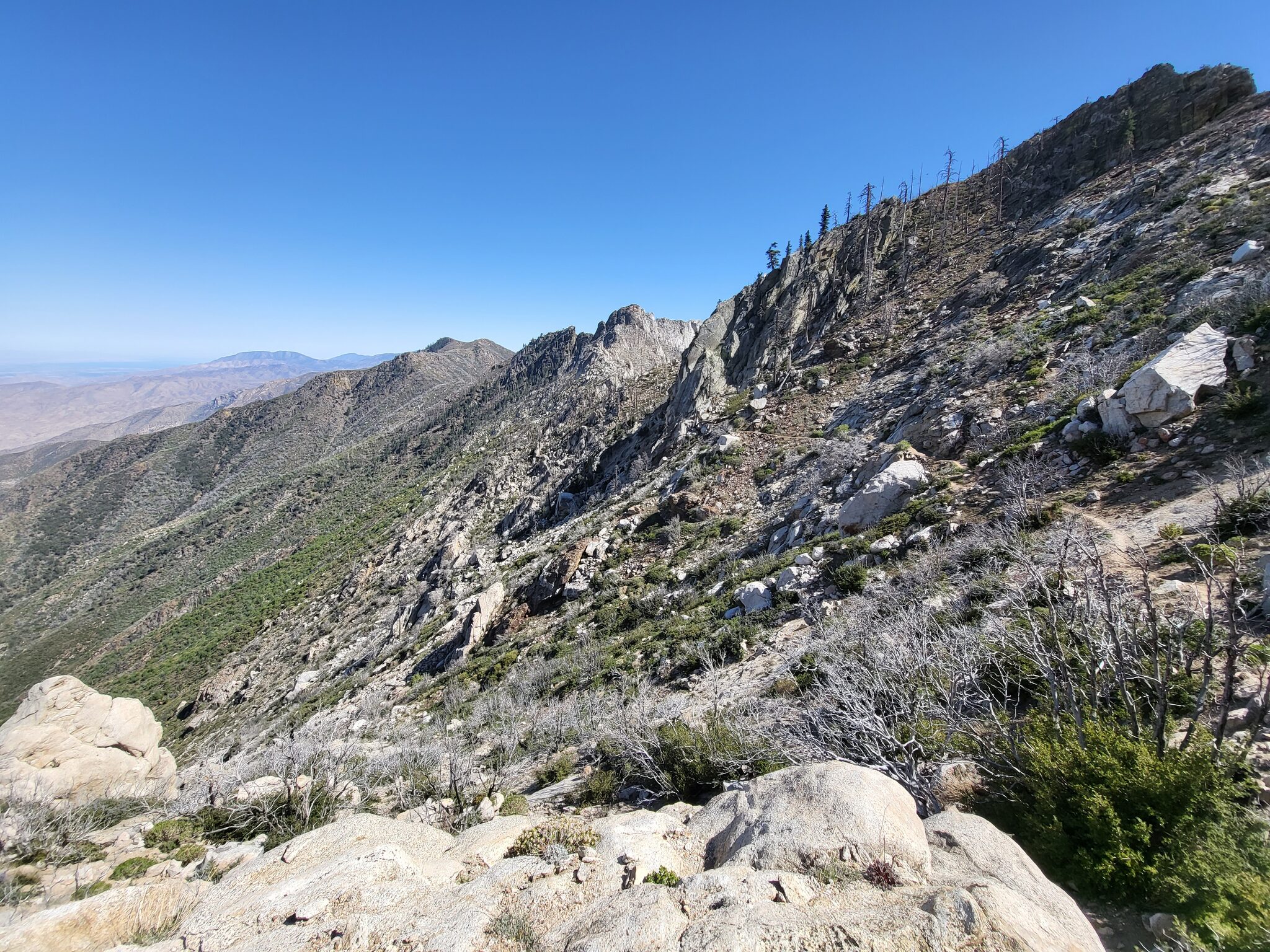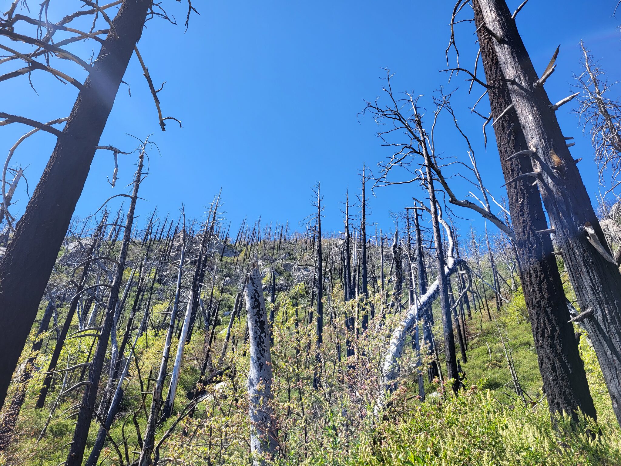 Procházím lesem, který v roce 2017 shořel, je tu spoustu mrtvých zuhelnatělých stromů. Hikeři jim říkají "widow makers" protože mohou kdykoliv spadnout a je velmi nebezpečné v jejich okolí stanovat. Resp. ono se v těchto oblastech ani stanovat nesmí. A kdo to porušuje, je blázen.