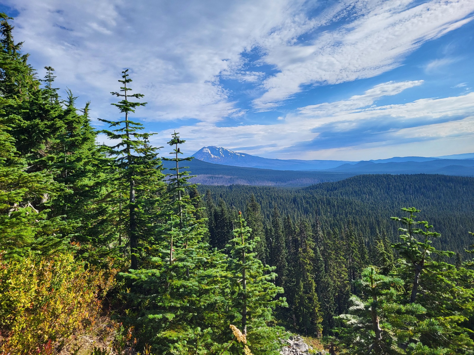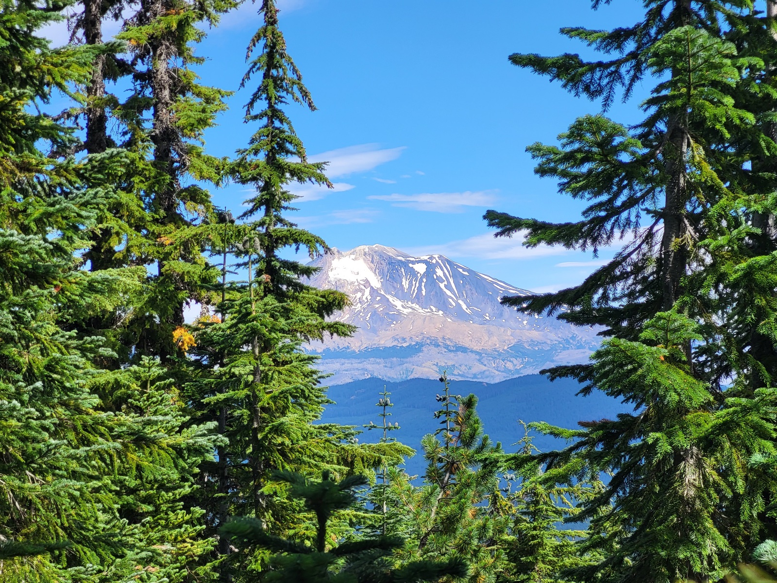 Mt. Adams už se hodně přiblížil, ale pořád je schovaný za stromy. Nádherná zasněžená hora.