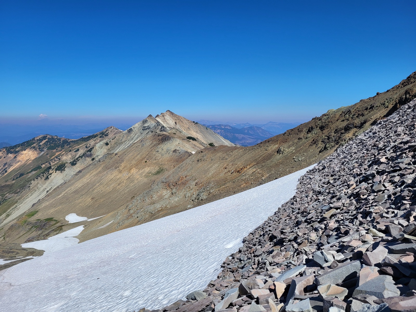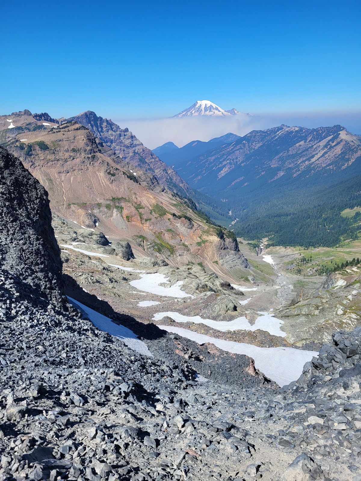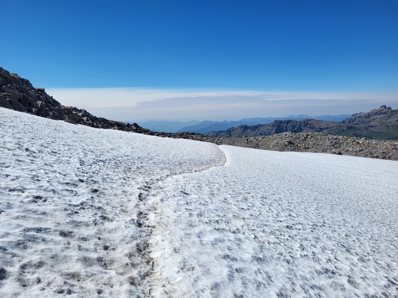 Pokračuju dál a vyškrábu se na další kopec a přede mnou se otevře něco neskutečnýho. Packwood glacier, výhled na goat wilderness a v dálce mt. Rainier. Nějakou chvíli jenom stojím a zírám. Dělám fotky a najednou na pravé straně mt. Reinier vidím velký sloup dýmu. Před chvílí tam ještě nebyl. Jak nás to ovlivní ale zjistím až zítra.