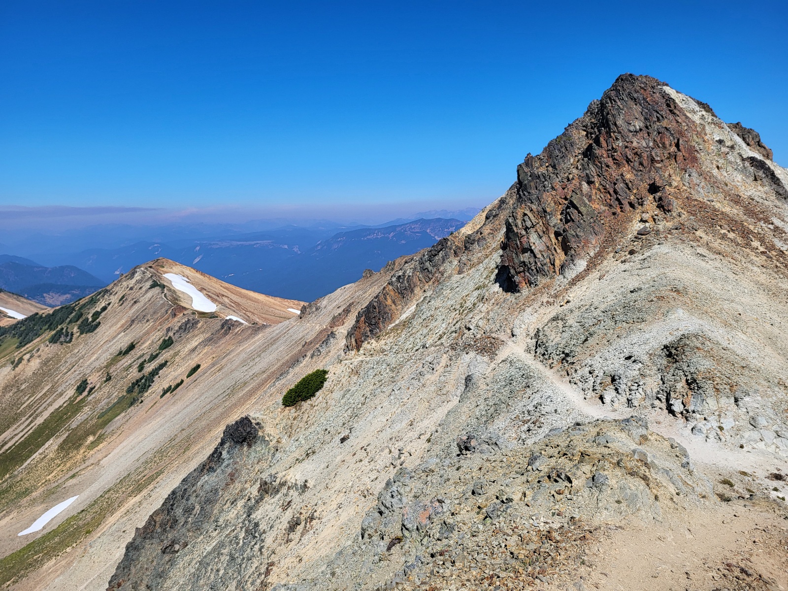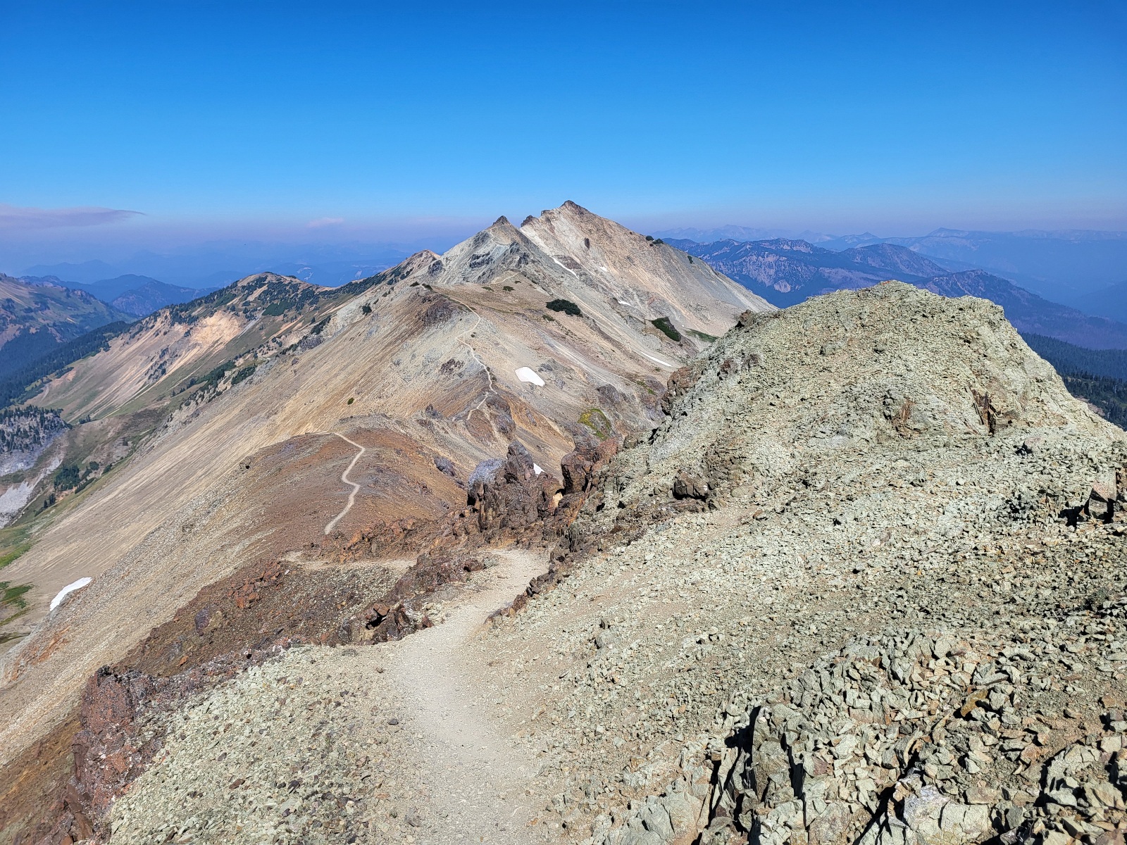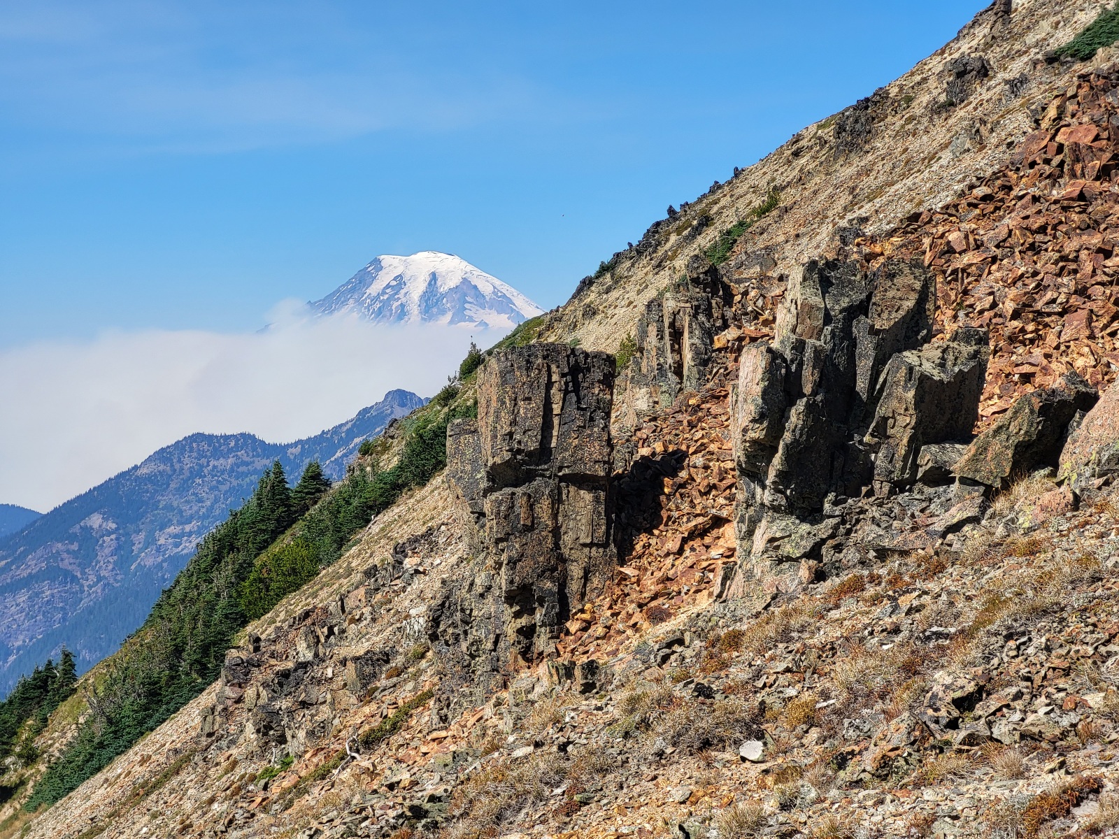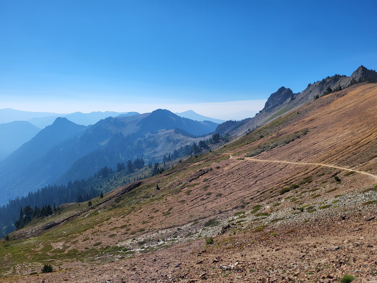 Pokračuju dál a vyškrábu se na další kopec a přede mnou se otevře něco neskutečnýho. Packwood glacier, výhled na goat wilderness a v dálce mt. Rainier. Nějakou chvíli jenom stojím a zírám. Dělám fotky a najednou na pravé straně mt. Reinier vidím velký sloup dýmu. Před chvílí tam ještě nebyl. Jak nás to ovlivní ale zjistím až zítra.