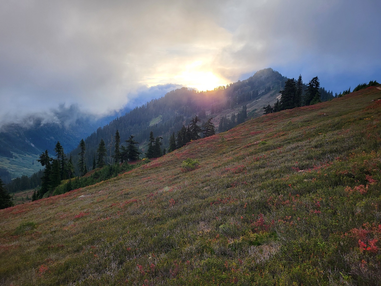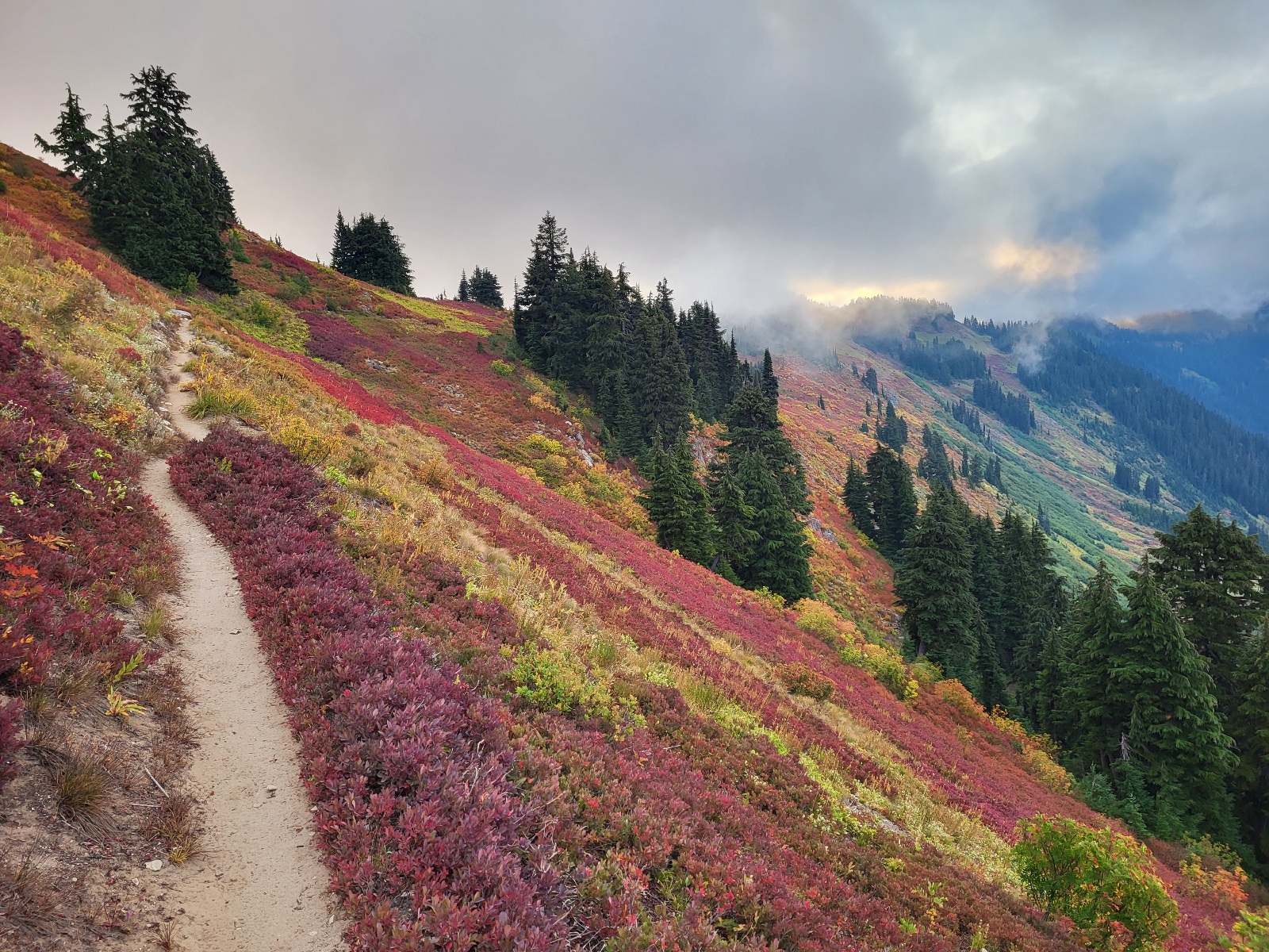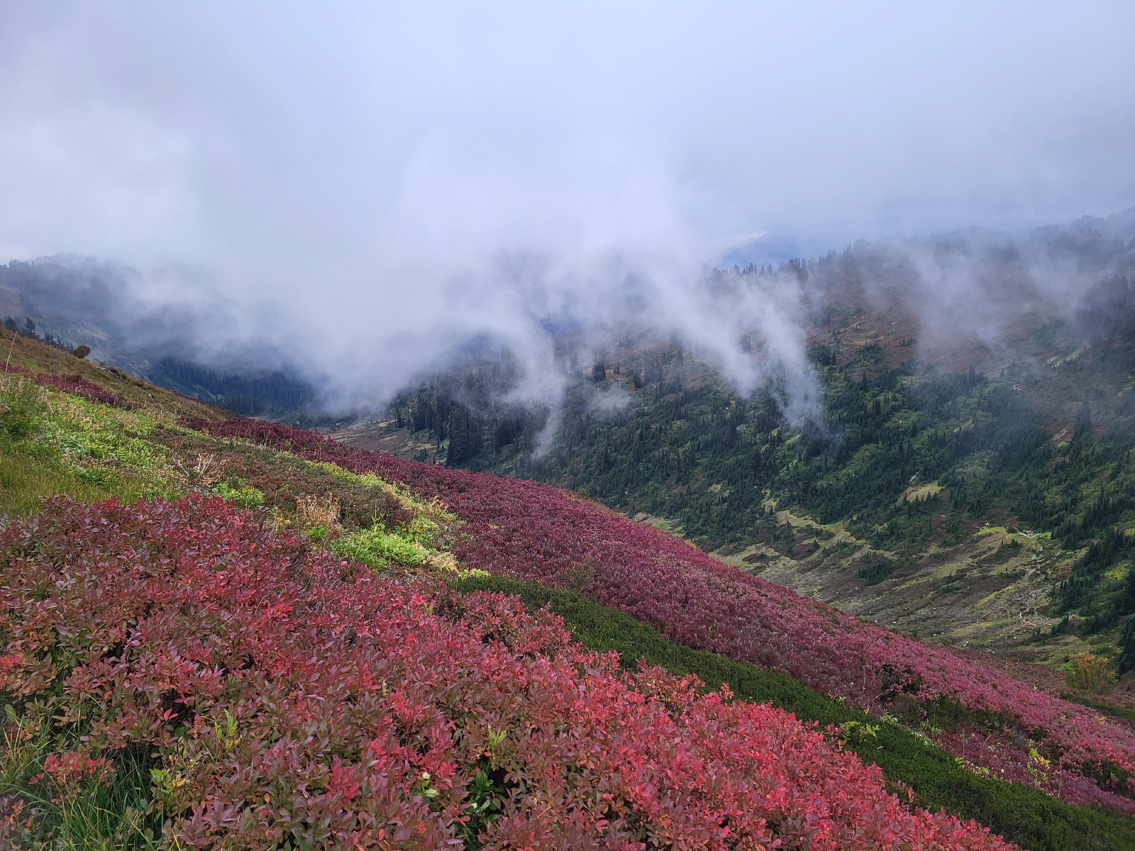 Opět nádherný výhledy a svahy jsou pokrytý červenejma borůvkama. Skrz mraky občas prosvitne slunce, ale většinou jenom na par sekund a mraky zase všechno prekryjou.