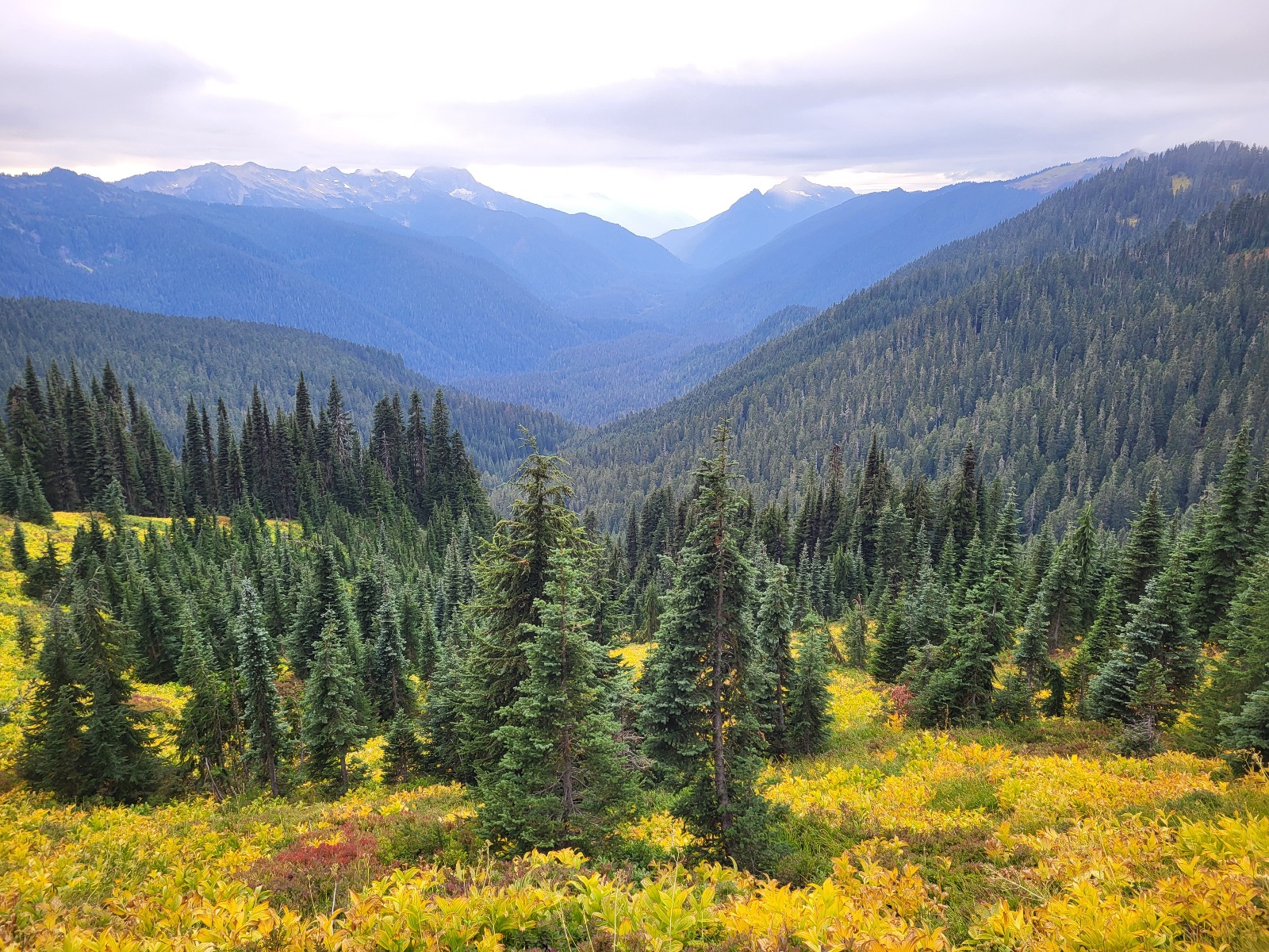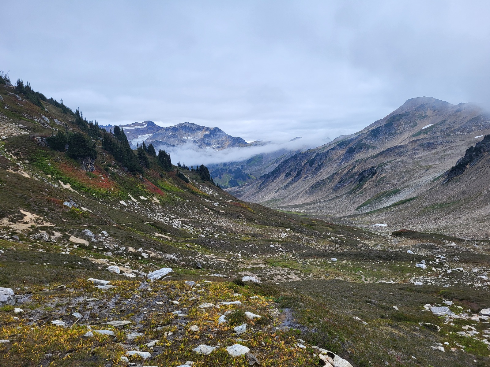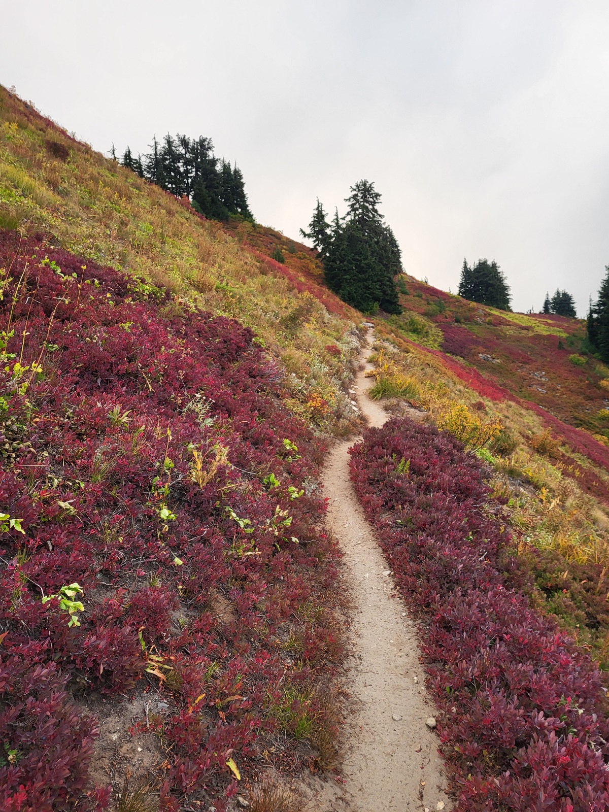 Opět nádherný výhledy a svahy jsou pokrytý červenejma borůvkama. Skrz mraky občas prosvitne slunce, ale většinou jenom na par sekund a mraky zase všechno prekryjou.