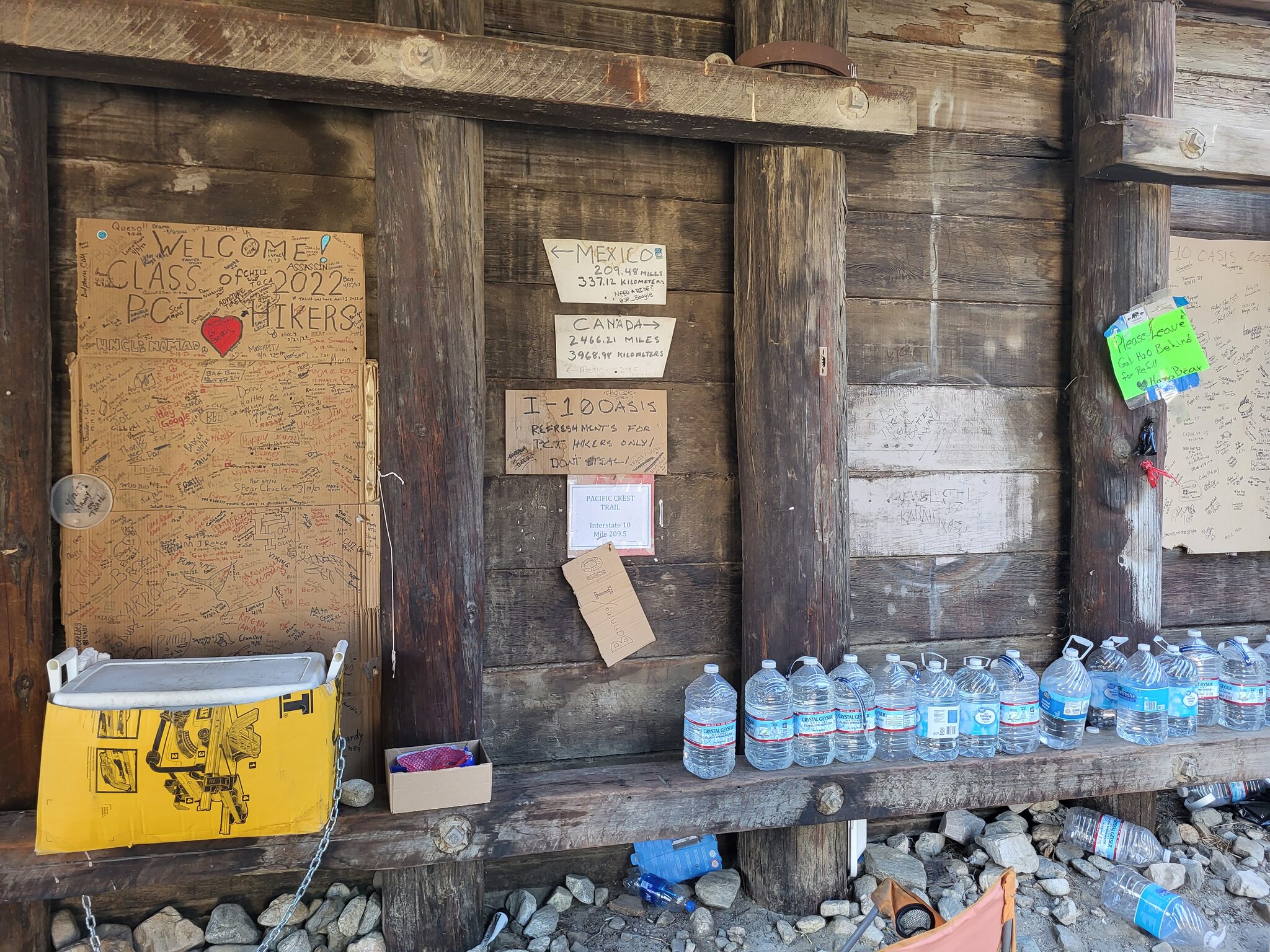 A po asi hoďce přicházím pod most, kde na chvíli vorazím. Je tu spoustu tabulí, kam se podepisují všichni hikeři class 22 a několik hiker boxů. Jsou tu i chladící boxy na pití, ale už v nich žádné není. Jdu pozdě.
