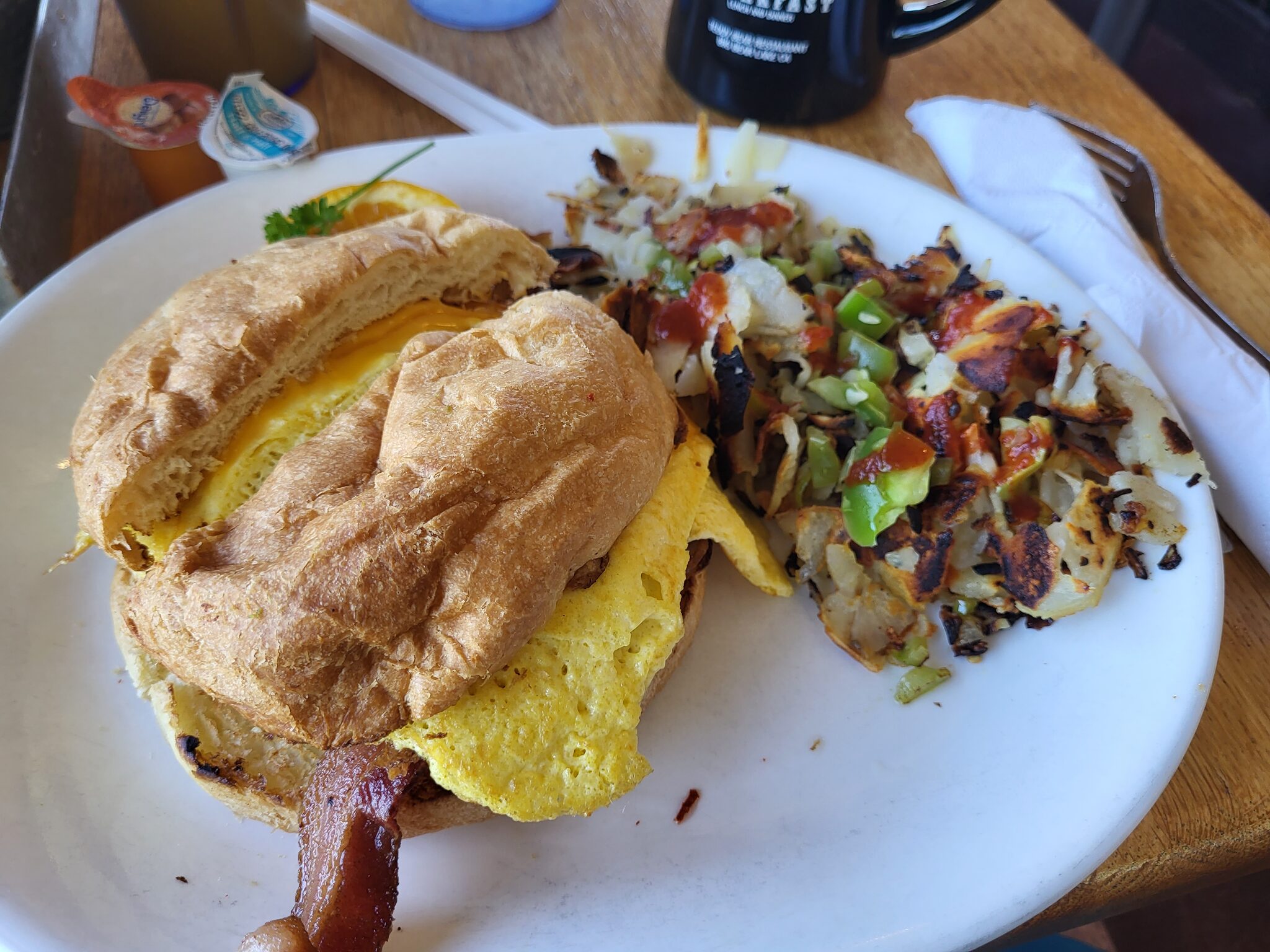 Je 10, jdu na recepci. Checkin bude v jednu, tak nechávám batoh tam a jdu na snídani do teddy bears restaurant. Beru vajíčka s toustem a bramborama.