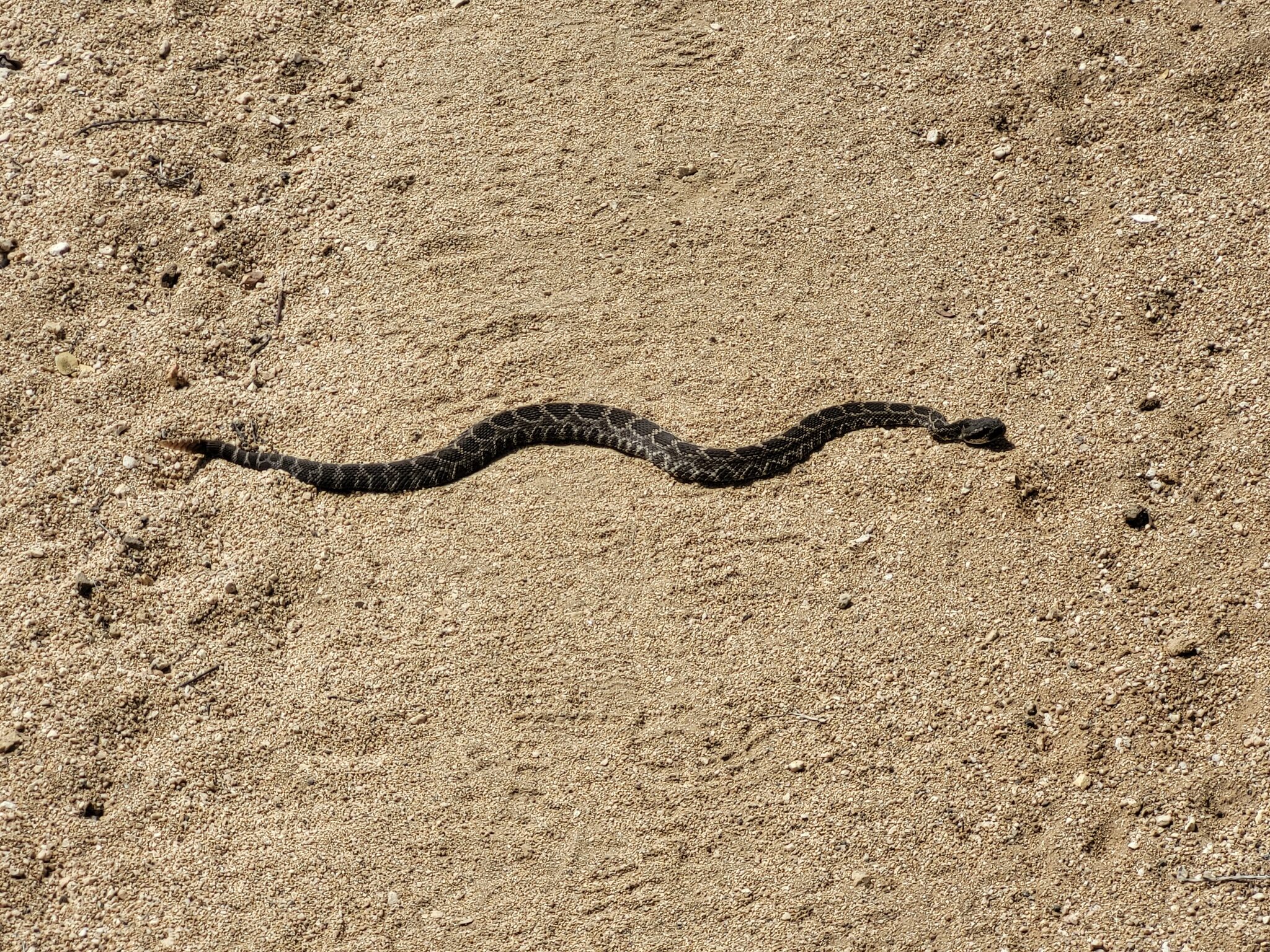 Mírným vytržením z funění je malý chřestýš, který nám nechce uhnout z trailu. Přemluvím ho kamenem a jak je naštvanej, tak nám na rozloučenou fest zachřestil.