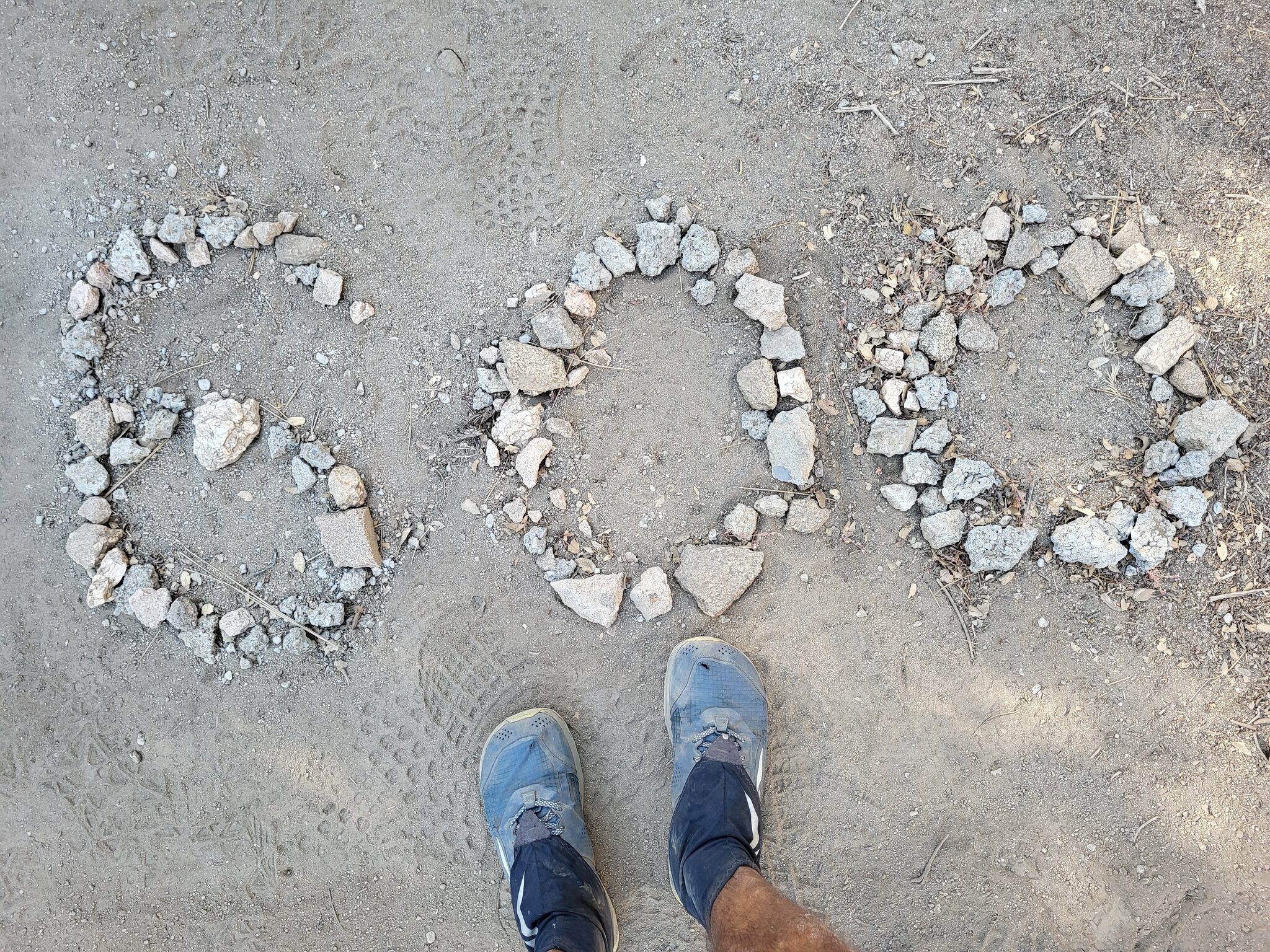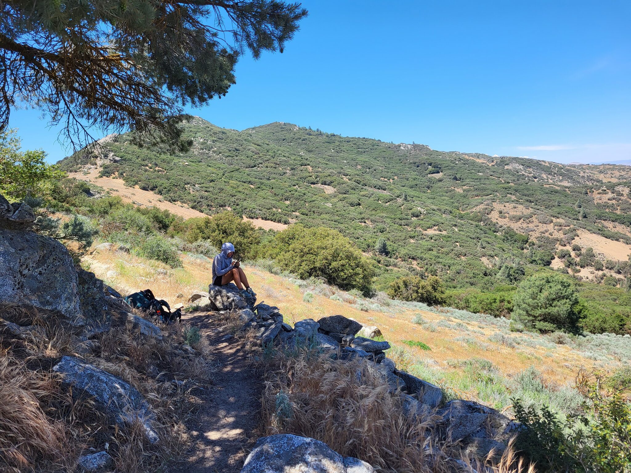 Po 4 majlích sedáme na snídani. Rychlovka, bagel a klobaska. Pokračujeme a na kameni sedí Adventure Time. Zjevil se včera u pramene. Naposledy jsem ho viděl v KOA. Tak zvláštně se objevuje a zjevuje.