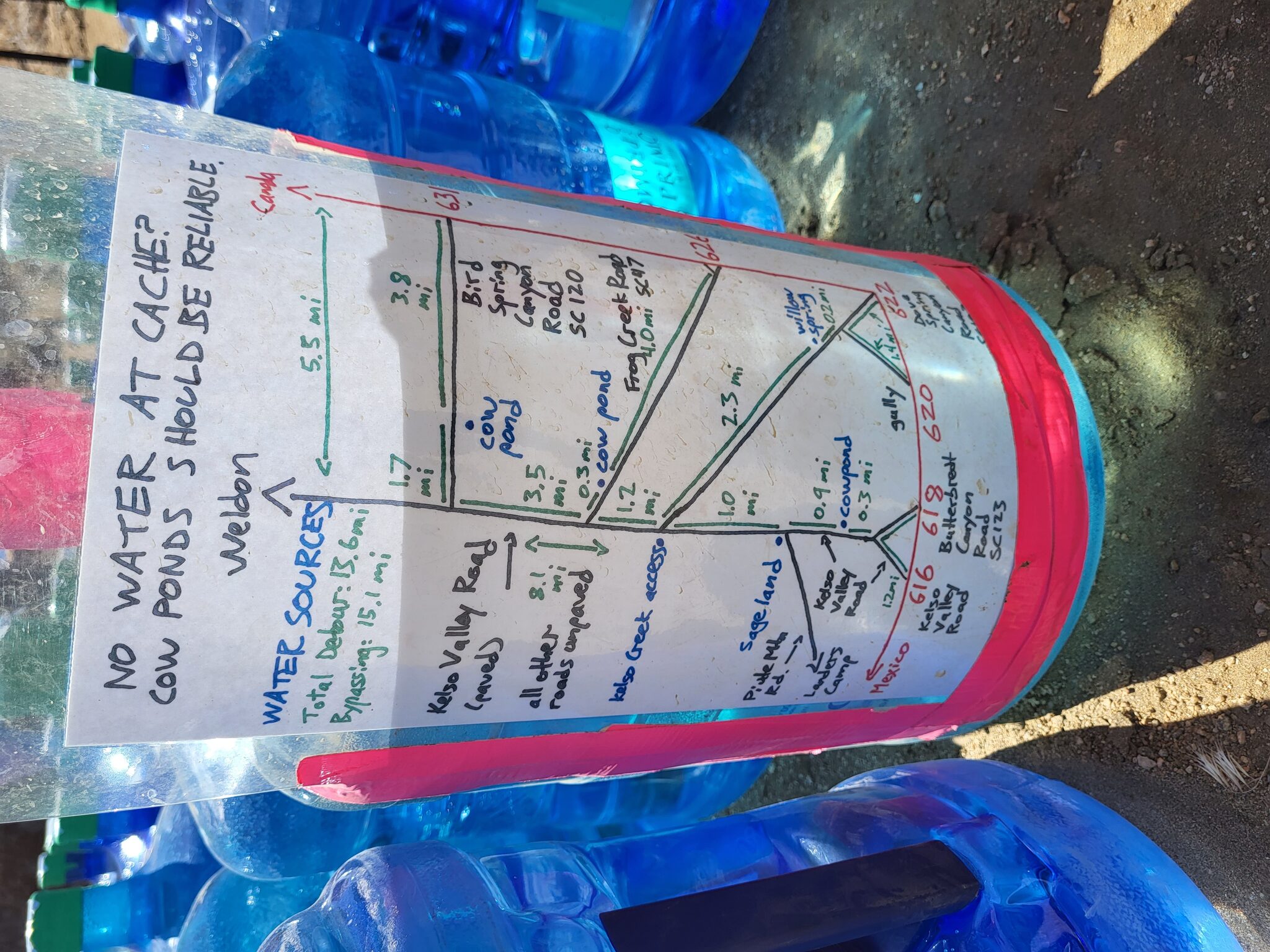 Pak jdeme dál a po asi 2 hodinách přicházíme k watercache. Pořád se řeší ti nemocní hikeři, takže celá watercache je úplně nová. Desitky galonů vody. Všude jsou nápisy, ze si máme před i po sáhnutí na cokoliv ruce očistit desinfekcí, která tam je přiložena. Je to neskutečný, tohle všechno obstarali dobrovolníci. Musela to byt strašná práce to natahat. Voda chutná trochu po desinfekci, Ale to se asi dá pochopit vzhledem k situaci.