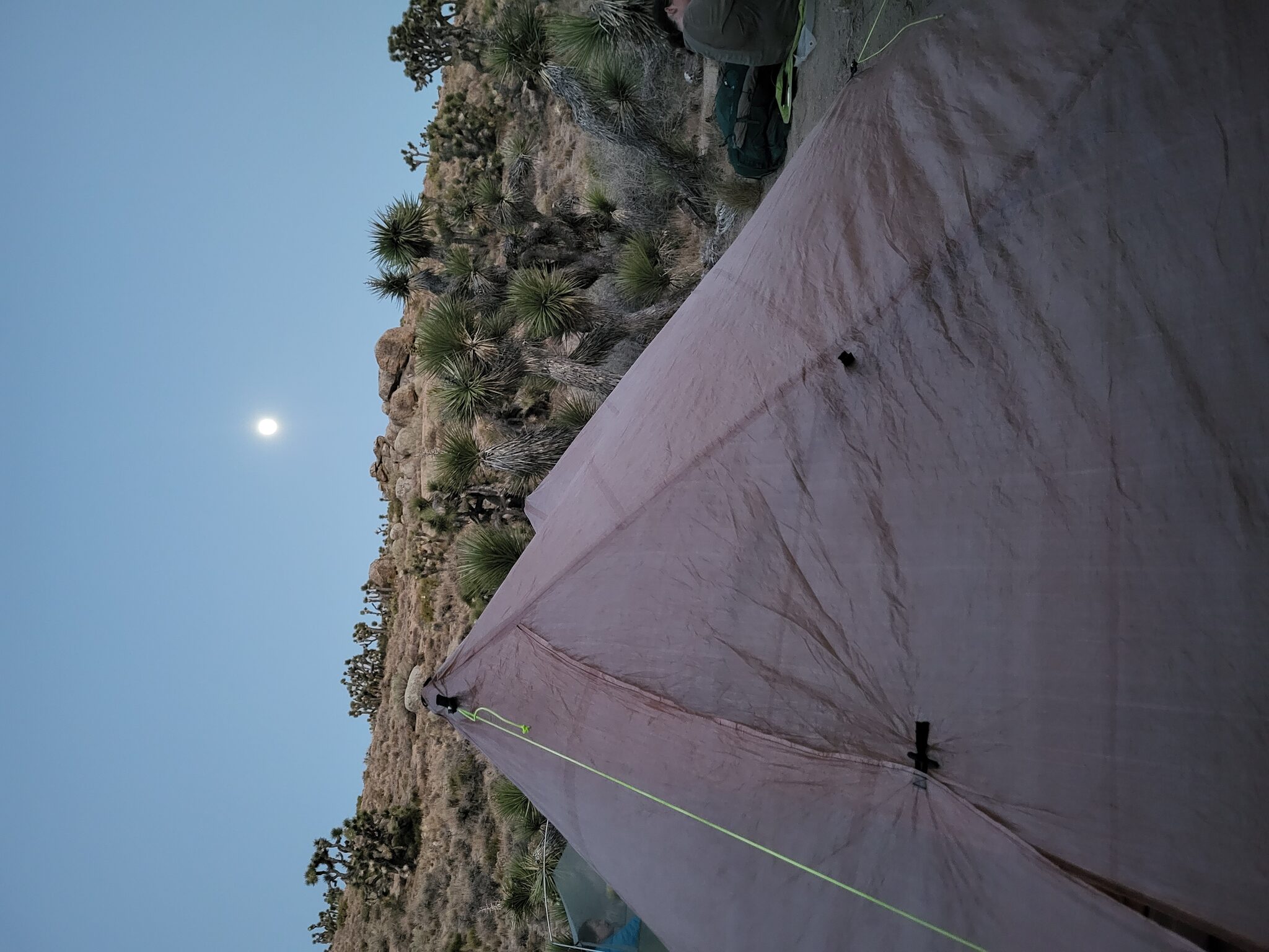 Do nocoviště to máme cca 7 mil. Snažíme se to stihnout do osmi. Horko trochu polevuje, ale musíme znovu něco nastoupat. Stiháme to, ale poslední míli přichází příšerný vitr. Opět se pereme o každý krok. Misto na spaní se blíží a jsem nervózní, jestli to bude takhle foukat i tam, tak to bude zase noc.