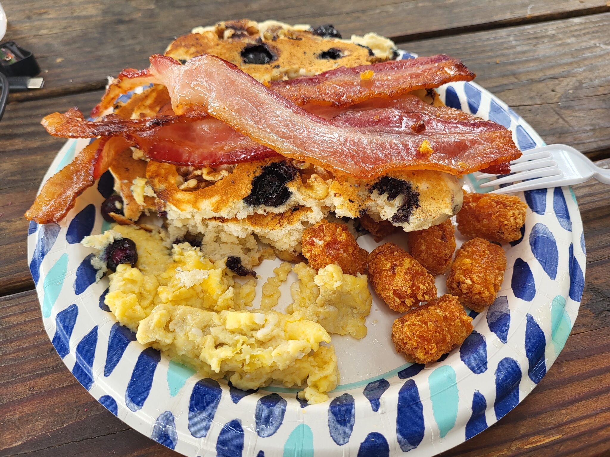 K jídlu jsou jenom palačinky se slaninou a vajíčkama. Sice jsem se těšil na burger, ale hlad mám, takže nepohrdnu.