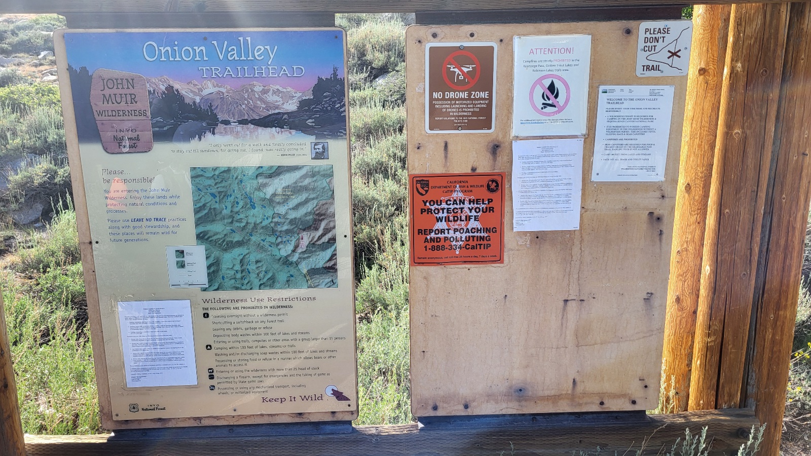 Snažíme se stopovat, ale nic. Je nás 5. To je moc. Najednou (opět z protisměru) se otáčí velký track a vystupuje starší chlapík, že jestli chceme na trailhead, tak nás tam hodí. Všech 5. Neskutečné. Jenom pro představu. Je to 40 mil do Indepedence, pak 13 mil neskutečnej stoupák na parkoviště k trailheadu. Jedeme cca 50 minut. A nic za to nechce. Že žena taky hikuje, tak ví jak je to těžký. Sotva vystoupíme, hned se objeví 2 hikeři, jestli by je nevzal do města a on zase souhlasí. Opravdoví andělé jsou tyhle lidi.