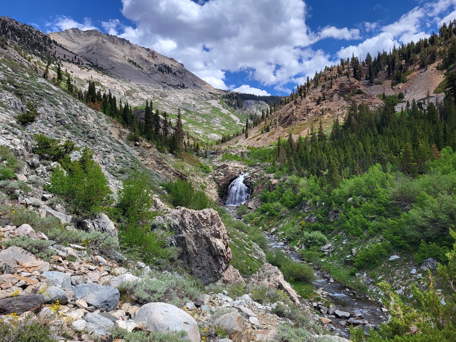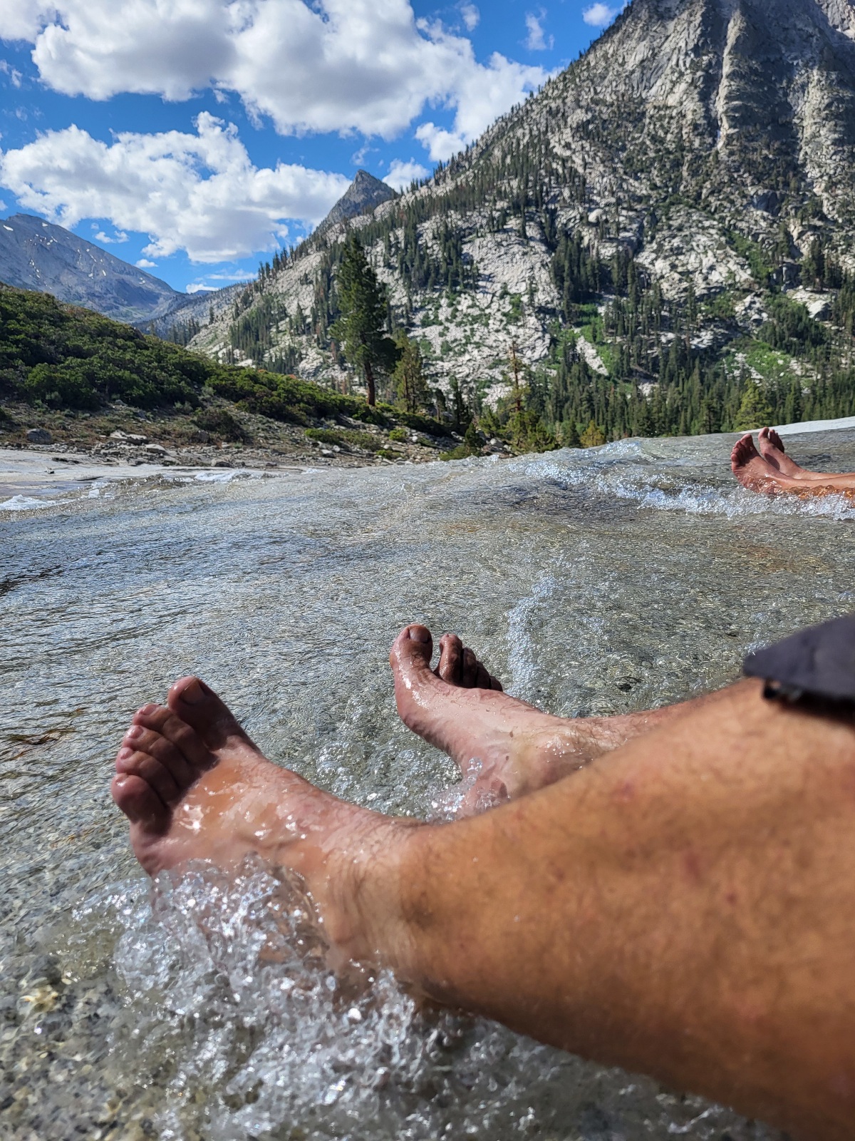 Přes most opouštíme kemp a pokračujeme směr Pinchot pass. Stoupání dnes bude celkem 1114m. Je nám jasné, že dnes to opět žádný mílový rekord nebude. Neujdeme ani 2 míle a přijdeme ke skále, po které se valí voda. Místo se nám moc líbí a tak opět zastavujeme a kocháme se.