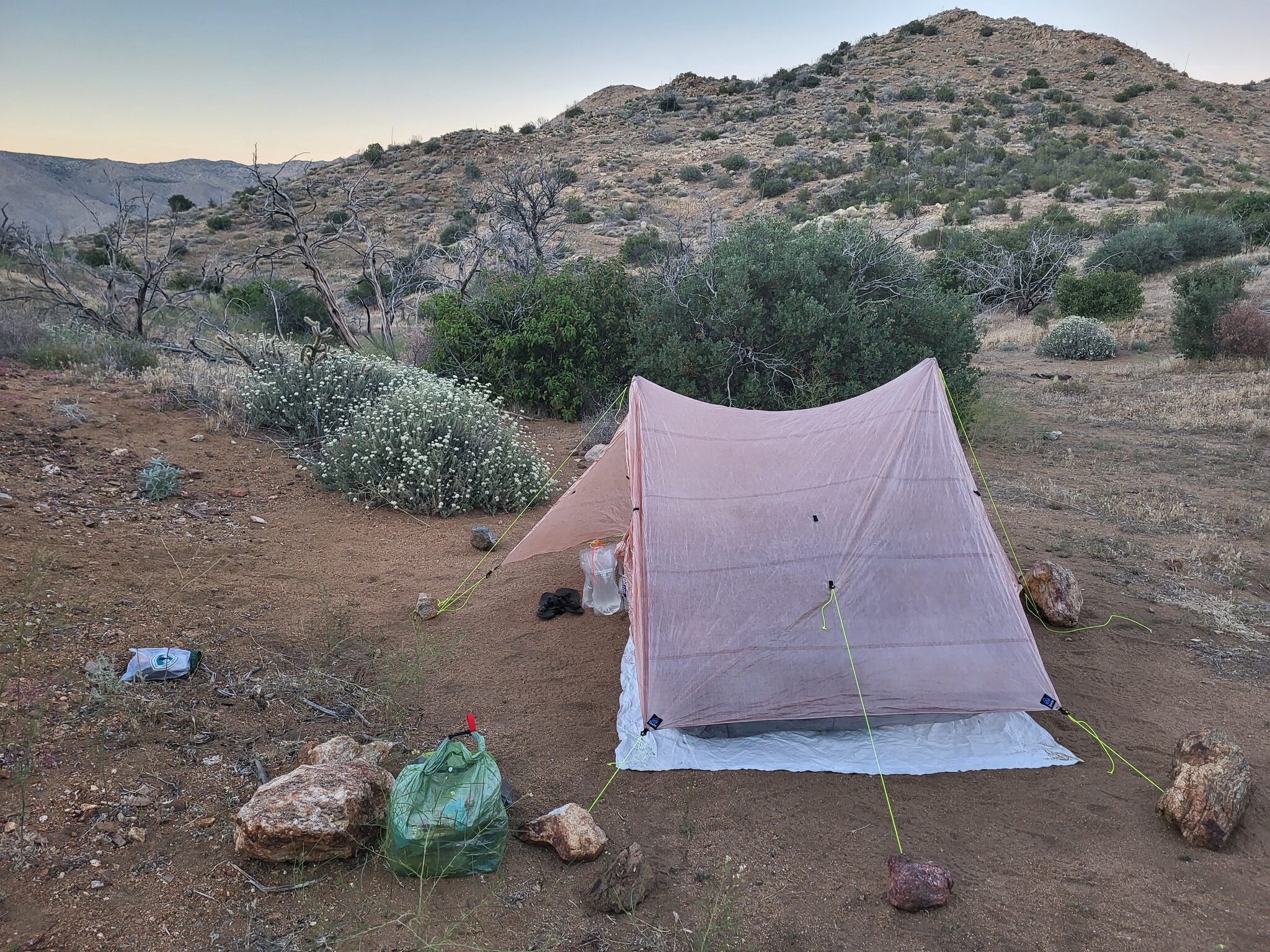 Dorazím nakonec na míli 84.4, kde má být nocoviště a co nevidím, jsou tu všichni kromě Steina. Ten je prý až na 87. míli. Místa už moc není, ale asi 100m od party je krásný plácek. Už se stmívá, takže rychle stan, vařím chilli ramen a pak chvíli kontrola nohou. Zatím vše v pořádku. Mám malé náchody. Přesto masíruju a mažu krémem.