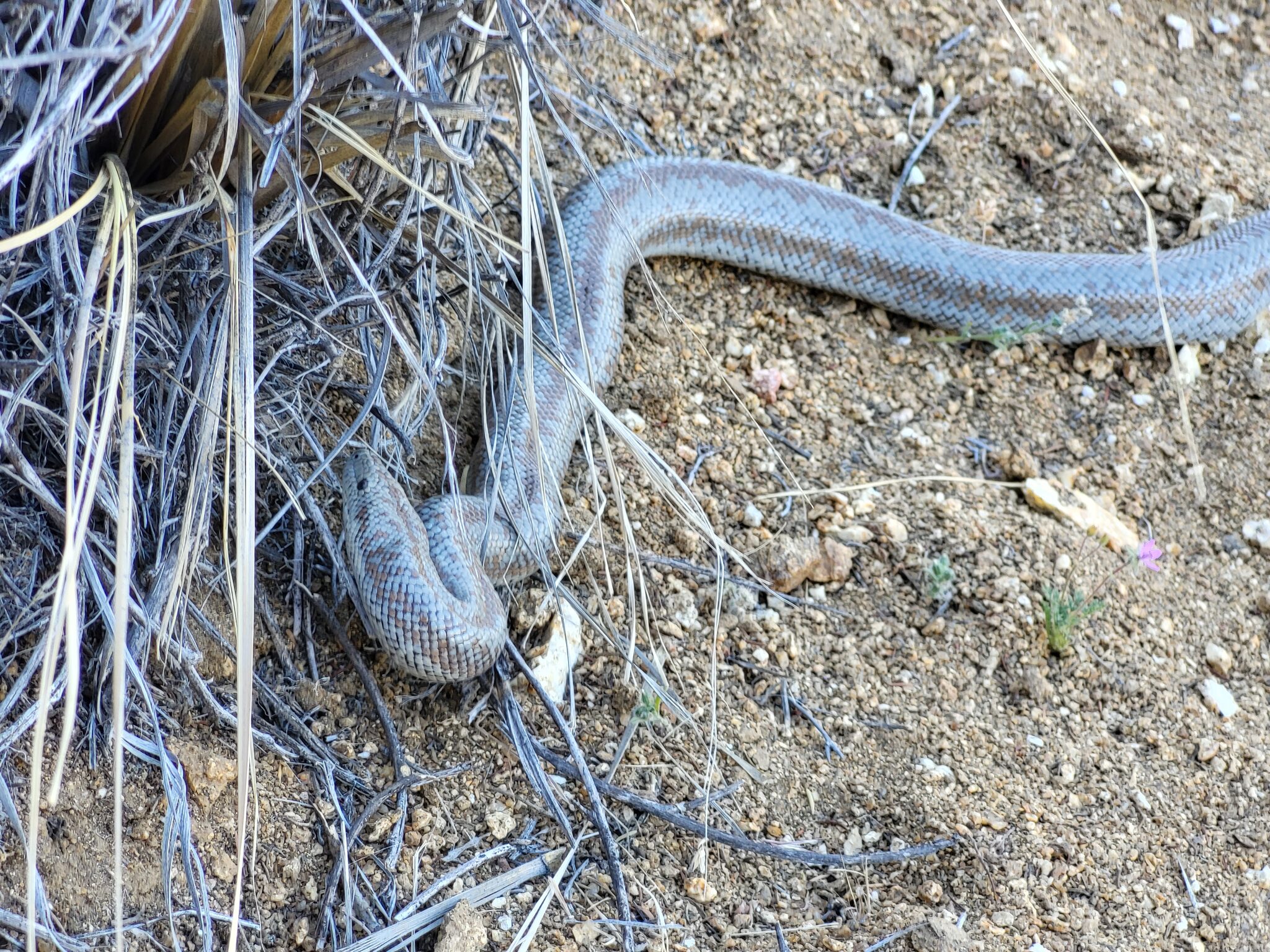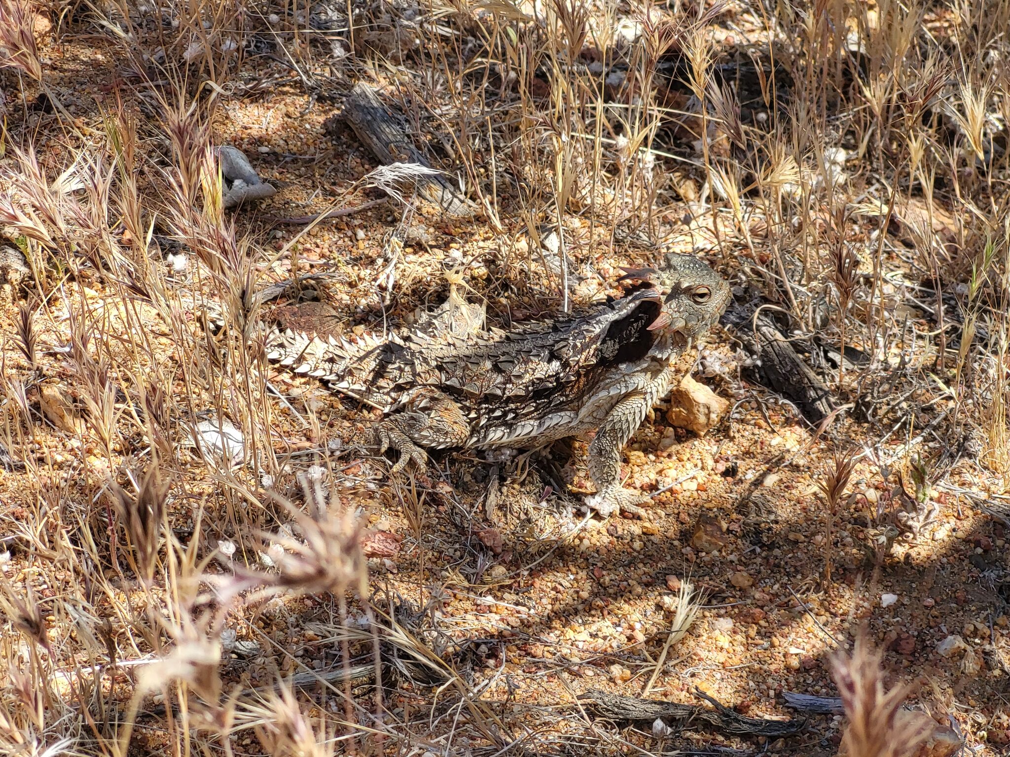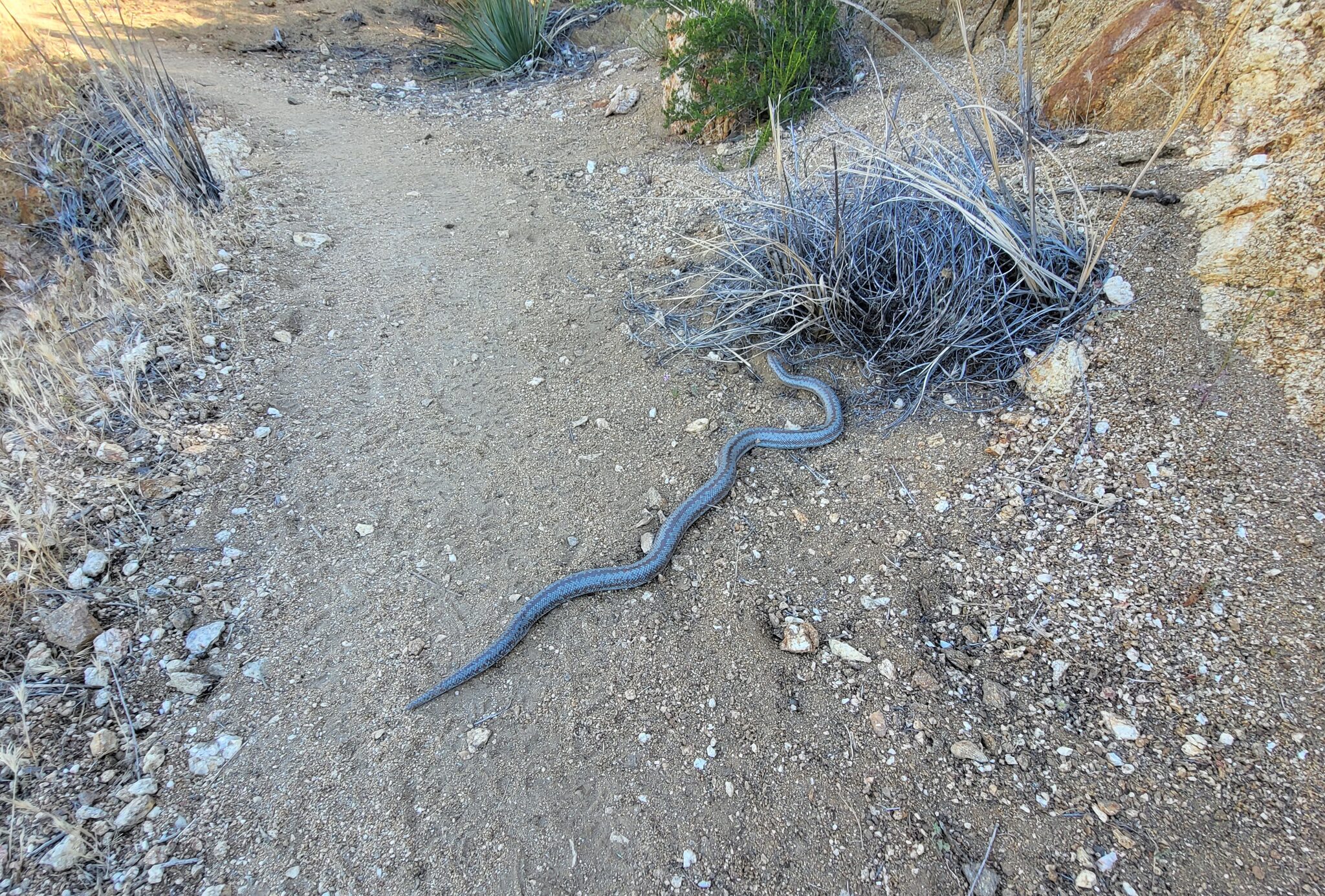 Už se tolik nebojím, že potkám hada a tak pouštím do uší Heriotta. Procházím ostrou zatáčkou a … had, naštěstí hned poznám, že to není chřestýš, takže nepanikařím a odvážím se i fotit zblízka. A za rohem zase taková ta ještěrka 🦎 co vypadá jako malej dráček. Taky fotím nějaký kaktusy.