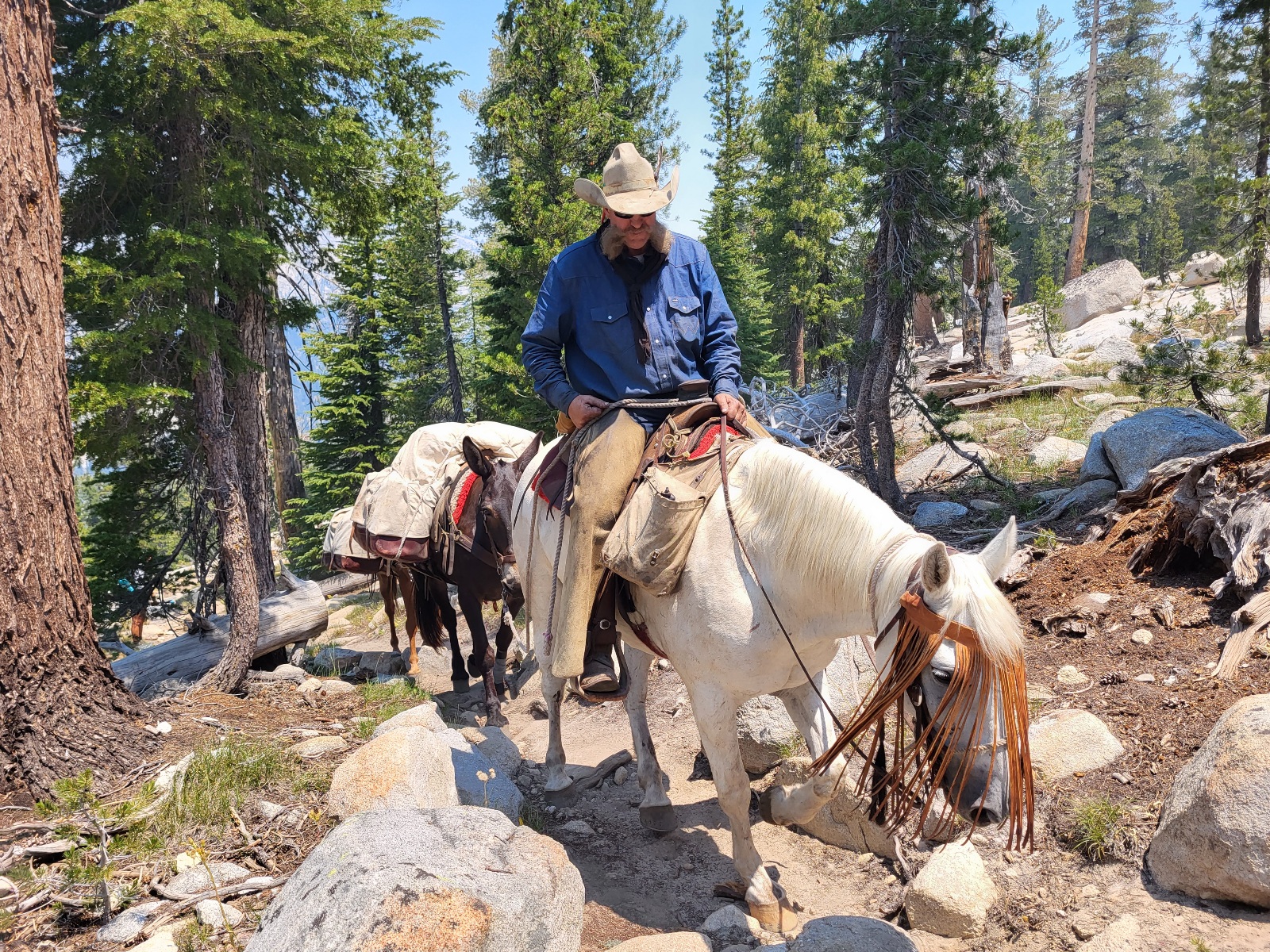 Za chvíli dorazí SaH, že valíme k jezeru. Že ma být teplý (haha, dobrej vtip v Sierra) a že je tam písek. Tak se pomalu zvedám a jdeme. Potkáváme další horse train. Tentokrát jede i pravej cowboy.