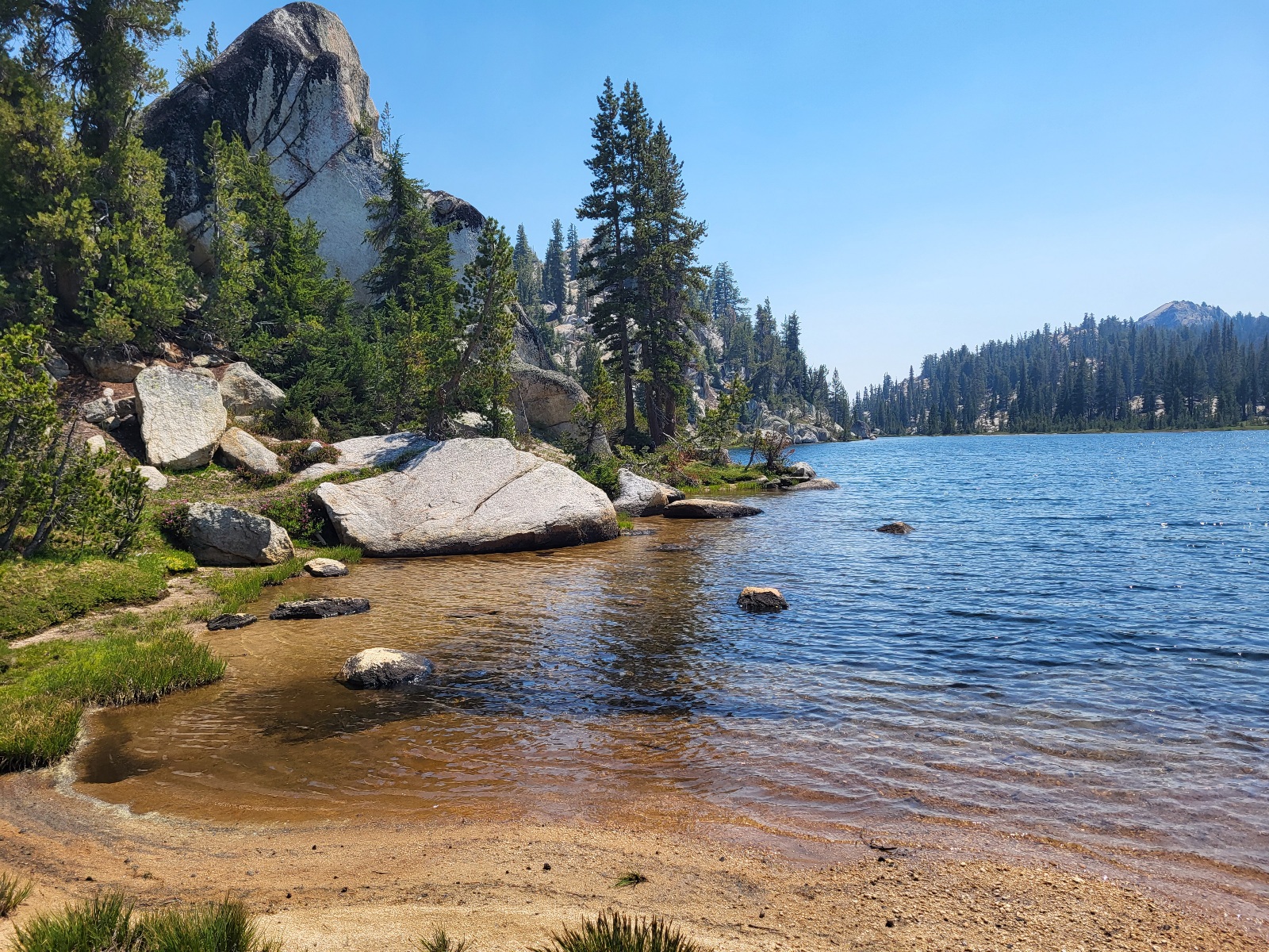 Po asi další hodině konečně přicházím k jezeru. Pěkný, písčité plážičky. Už jsou tu nějací hikeři, ale pakuju se bokem do stínu.