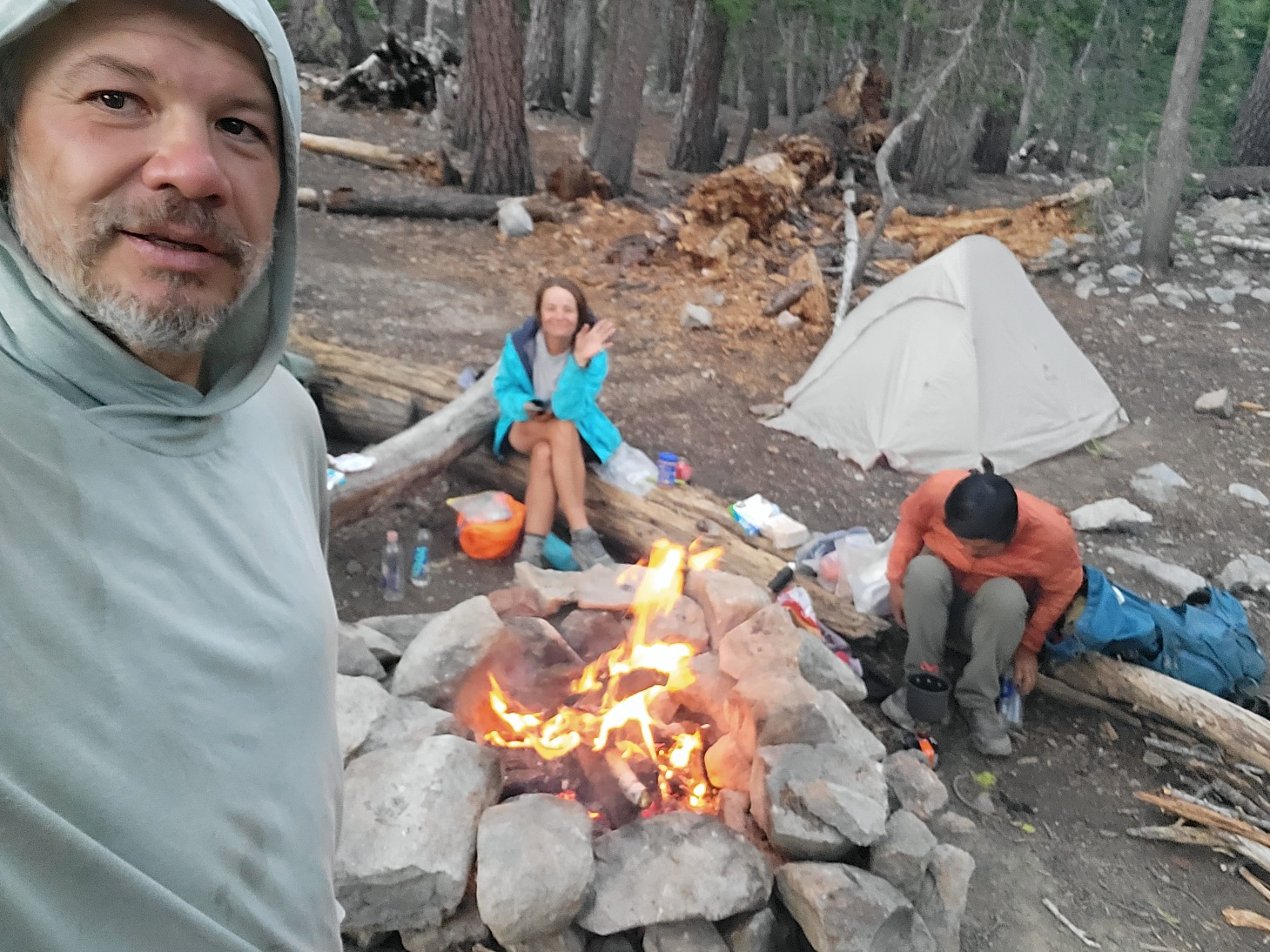 Kolem pul sedme dorážíme na kempsite. Stavíme srany a pak rozděláváme oheň kvůli komárům. Moc jich tu naštěstí není, ale i málo je moc :) a je tu pěkné ohniště.