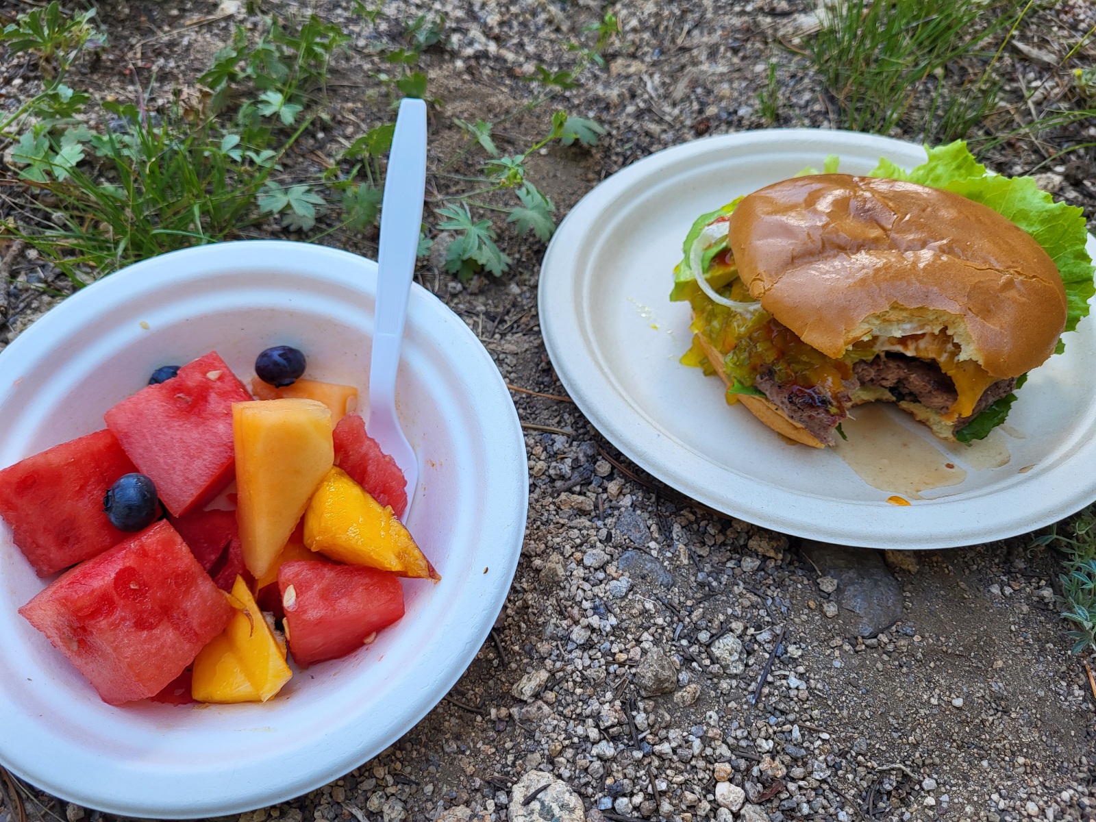 Dorážím k silnici, SaH mě zase dohonila. Na druhé straně silnice vidíme 3 party stany, židličky a několik hikerů. Hned se nas ujme človíček. Vítá nás a ptá se, jestli jíme maso, odpovídáme, že ano. Tak jestli si dáme cheesburger. Dáme :) Než bude hotový, máme si vzit nějaký salát, chlazenou sodu a cookies. A prý jestli máme nějaké děravé ponožky darn tough, tak nám je vymění za nové. Neskutečný.