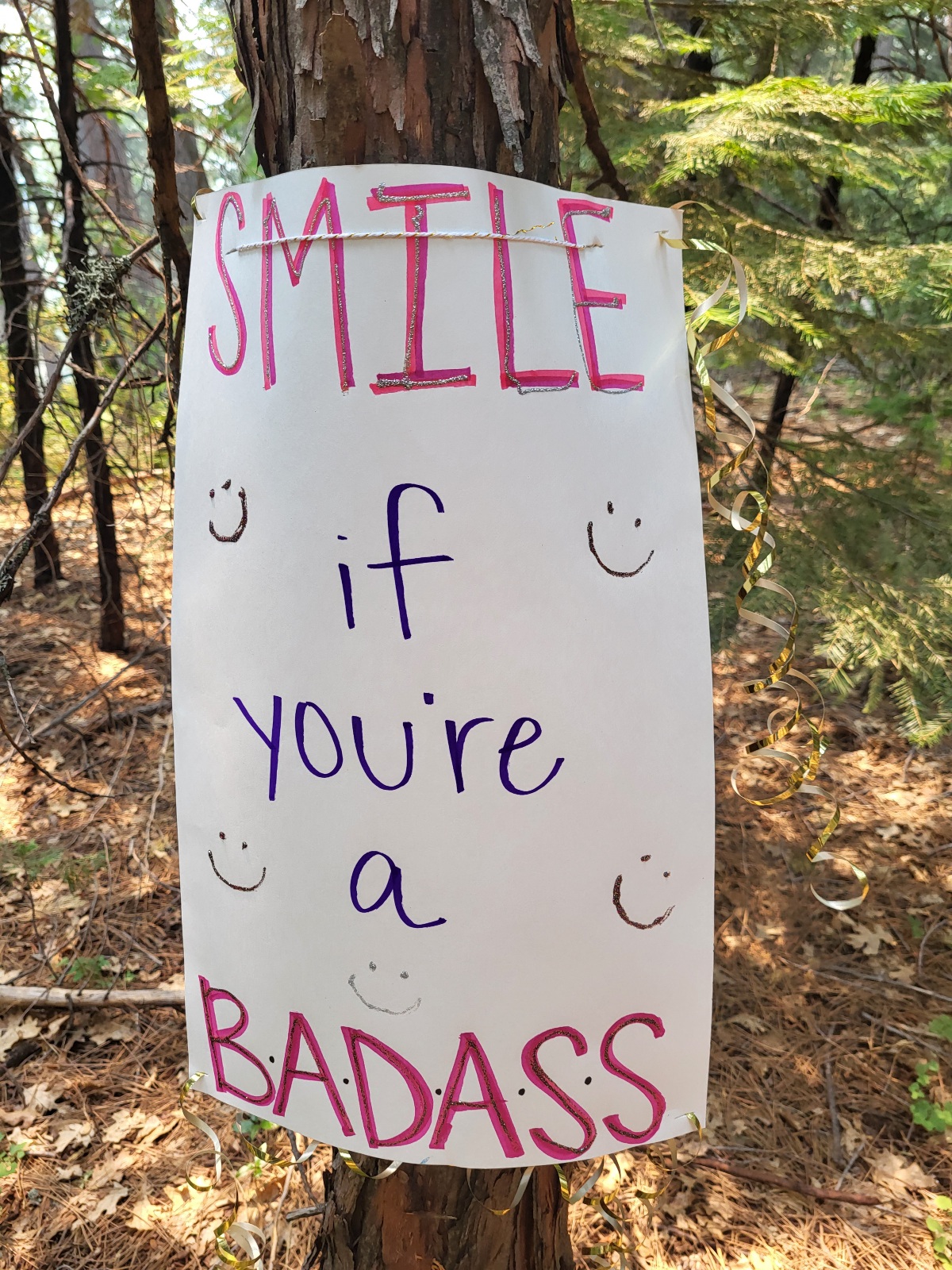 Přeběhnu most a valím k silnici. Najednou vidim na stromě čtvrtku s napisem: