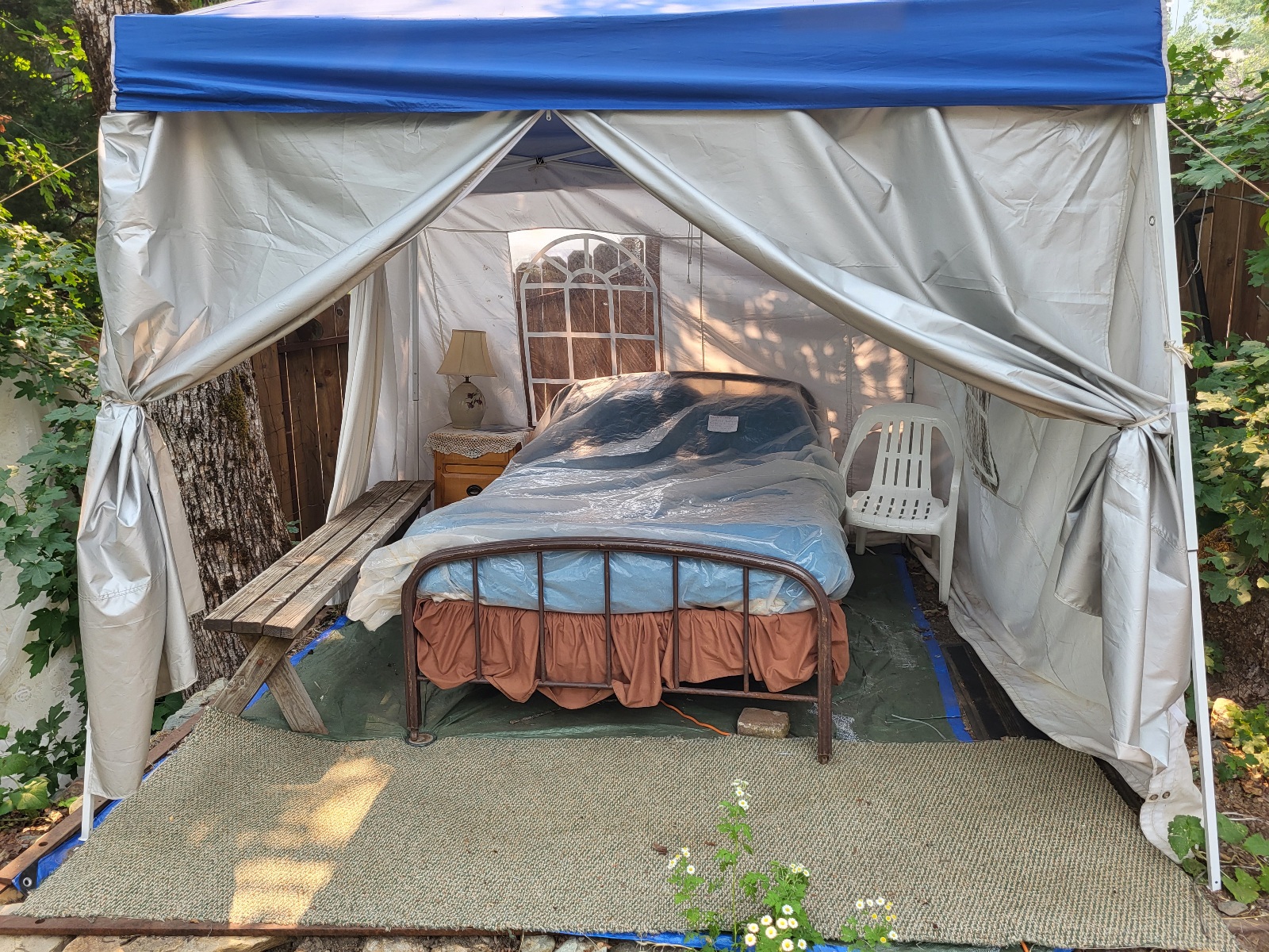 A skutečně, na verandě v postelí spí paní a pán.