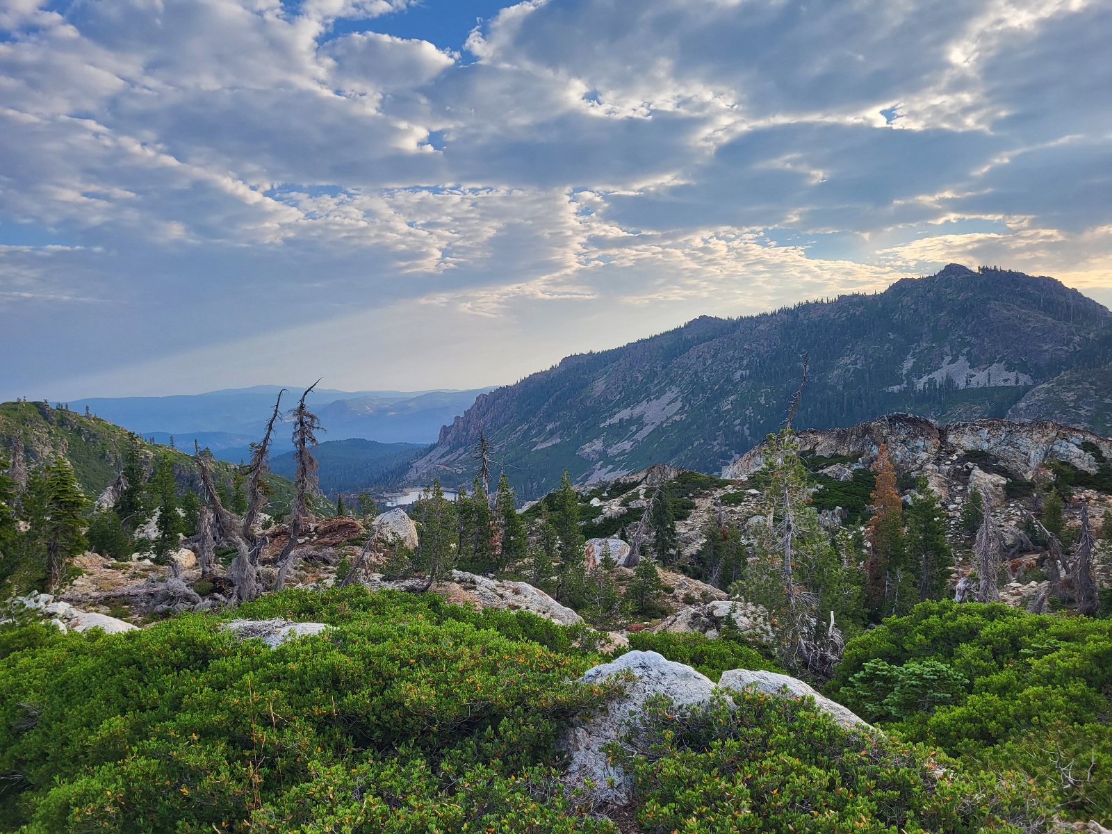 K večeru už jsem docela unavenej, ale nedaří se mi najít místo na spaní. Vlezl jsem do oblasti po požáru a je tu spoustu mrtvých stromů. Tady spát nemůžu.