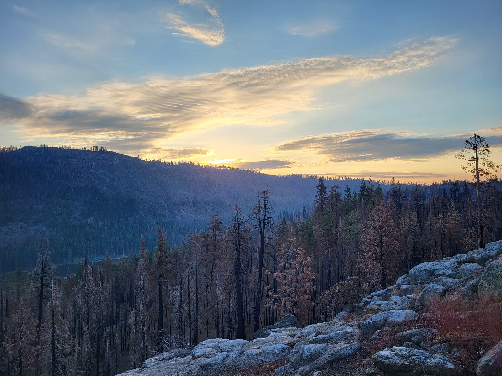 Zase vstupujeme do spálené oblasti a moje krásné boty jsou za chvíli jako prase od popílku. :( Po chvíli se zatáhne a začne pršet. Fakt pršet. Během chvíle jsem mokrej. Zmiňoval jsem se o tom, že nemám rain jacket?
